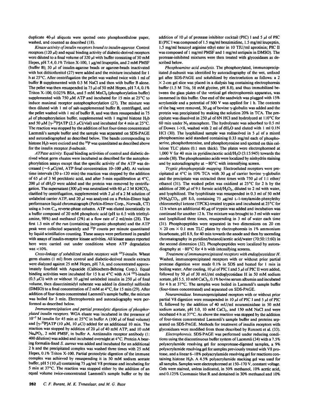 The effect of diabetes on the structure and function of insulin receptors was studied in rats 7 d after streptozotocin injection, using solubilized, partially purified receptors from rat hindlimb muscles. Diabetes increased the number of insulin receptors per gram of muscle 60-70% without apparent change in insulin binding affinity. Incubation of receptors at 4 degrees C with [gamma-32P]ATP and insulin resulted in dose-dependent autophosphorylation of the beta-subunit on tyrosine residues; receptors from diabetic rats showed decreased base-line phosphorylation, as well as a decrease in autophosphorylation at maximally stimulating insulin concentrations. These receptors also showed diminished exogenous substrate kinase activity using histone H2b and angiotensin II as phosphoacceptors. The electrophoretic mobility (sodium dodecyl sulfate-polyacrylamide gel electrophoresis) of a subpopulation of beta-subunits derived from diabetics was slightly decreased; differences in electrophoretic mobility between control- and diabetic-derived beta-subunits were enhanced by generating fragments by partial Staphylococcus aureus V8 protease digestion. Endoglycosidase-H or neuraminidase treatment increased the electrophoretic mobility of beta-subunits in both groups, but only neuraminidase appeared to decrease or abolish differences in electrophoretic mobility between controls and diabetics, suggesting that excess sialilation may account, in part, for the altered mobility of diabetic derived beta-subunits. All structural and functional alterations in insulin receptors were prevented by treating diabetic rats with insulin for 60 h. Peripheral insulin resistance associated with insulinopenic diabetes may be related to modifications in insulin receptor structure, resulting in impaired signal transmission.