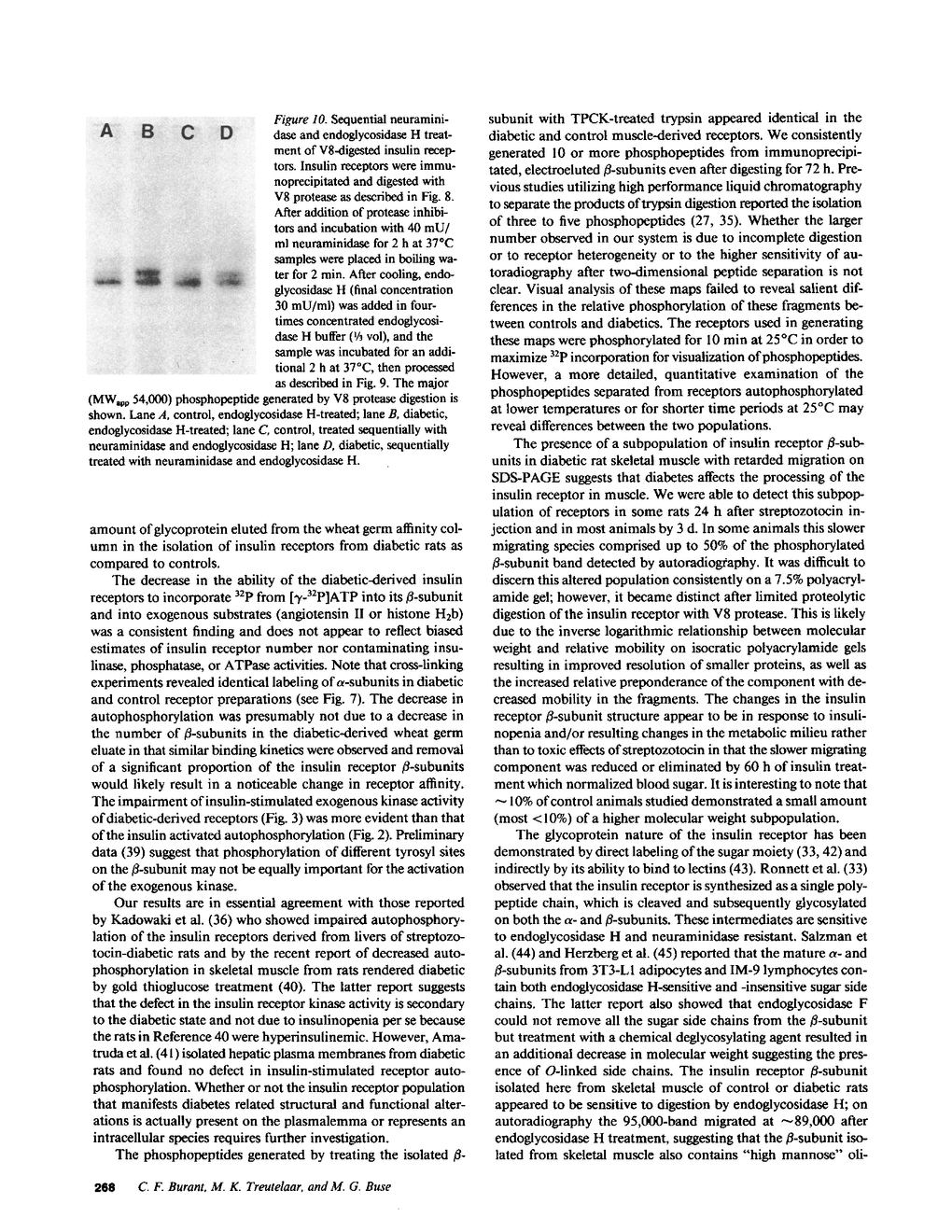 The effect of diabetes on the structure and function of insulin receptors was studied in rats 7 d after streptozotocin injection, using solubilized, partially purified receptors from rat hindlimb muscles. Diabetes increased the number of insulin receptors per gram of muscle 60-70% without apparent change in insulin binding affinity. Incubation of receptors at 4 degrees C with [gamma-32P]ATP and insulin resulted in dose-dependent autophosphorylation of the beta-subunit on tyrosine residues; receptors from diabetic rats showed decreased base-line phosphorylation, as well as a decrease in autophosphorylation at maximally stimulating insulin concentrations. These receptors also showed diminished exogenous substrate kinase activity using histone H2b and angiotensin II as phosphoacceptors. The electrophoretic mobility (sodium dodecyl sulfate-polyacrylamide gel electrophoresis) of a subpopulation of beta-subunits derived from diabetics was slightly decreased; differences in electrophoretic mobility between control- and diabetic-derived beta-subunits were enhanced by generating fragments by partial Staphylococcus aureus V8 protease digestion. Endoglycosidase-H or neuraminidase treatment increased the electrophoretic mobility of beta-subunits in both groups, but only neuraminidase appeared to decrease or abolish differences in electrophoretic mobility between controls and diabetics, suggesting that excess sialilation may account, in part, for the altered mobility of diabetic derived beta-subunits. All structural and functional alterations in insulin receptors were prevented by treating diabetic rats with insulin for 60 h. Peripheral insulin resistance associated with insulinopenic diabetes may be related to modifications in insulin receptor structure, resulting in impaired signal transmission.