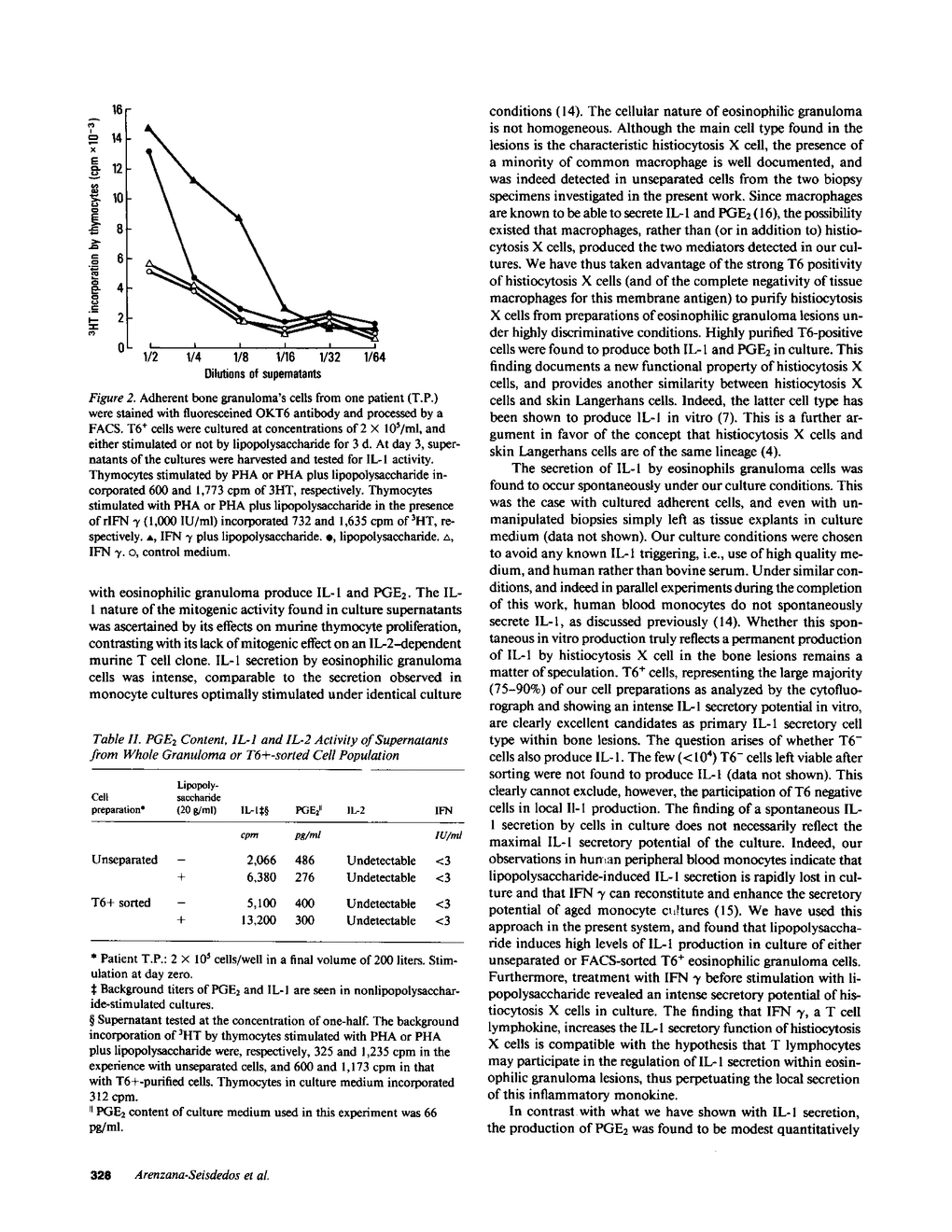 We have investigated the secretory function of cell suspensions from bone eosinophilic granulomas surgically collected in two patients with histiocytosis X. Unseparated cell preparations spontaneously produced interleukin 1 (IL-1) and prostaglandin E2 (PGE2). In order to ascertain that this secretion was due to the characteristic Langerhans cell-like histiocytosis X cells predominantly found in the bone lesions, we have purified T6+ cells by the use of a fluorescence-activated cell sorter. Such highly purified cell preparations were found to secrete IL-1 and PGE2 spontaneously in culture. Stimulation with endotoxins and treatment with interferon gamma (IFN gamma) revealed an intense IL-1 secretory function of histiocytosis X cells. Since both IL-1 and PGE2 are able to induce bone resorption in vitro, our findings are compatible with the hypothesis that histiocytosis X cells are responsible for the typical osteolytic lesion observed in histiocytosis X through the local secretion of these two mediators.