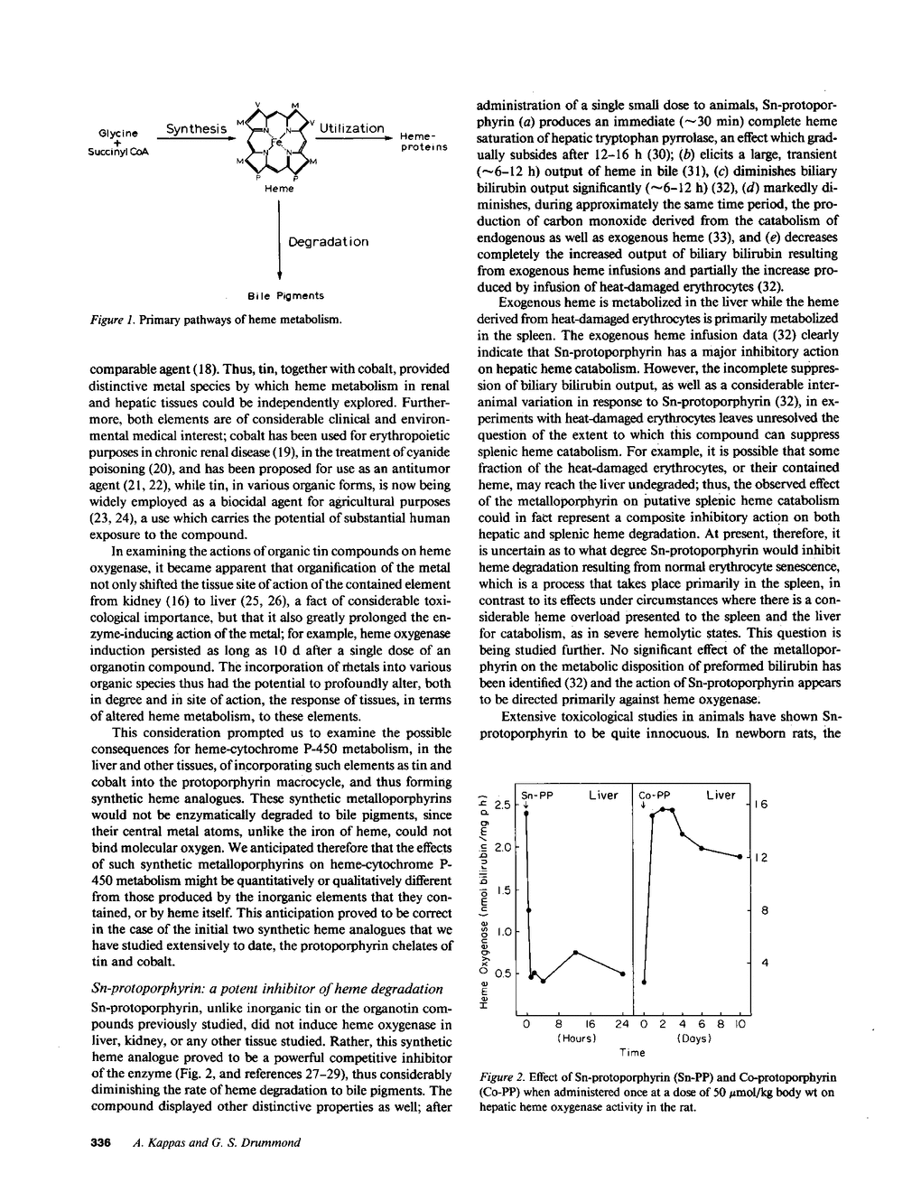 Studies with synthetic metal-porphyrin complexes in which the central iron atom of heme is replaced by other elements indicate that those heme analogues that cannot be enzymatically degraded to bile pigments possess novel biological properties that may have considerable clinical as well as experimental value. Such studies have revealed the important role that the central metal atom plays in determining the physiological and pharmacological properties of metal-porphyrin complexes; and they have demonstrated that the form in which animals and humans are exposed to trace metals, i.e., inorganic, organified, porphyrin-chelated, etc., can be of great importance in determining the biological responses that such elements elicit, especially with respect to actions on heme synthesis and degradation and cytochrome P-450 formation and function. Study of the biological properties of synthetic metalloporphyrins represents a potentially fruitful area of research and the results may have significant value for basic as well as clinical disciplines.