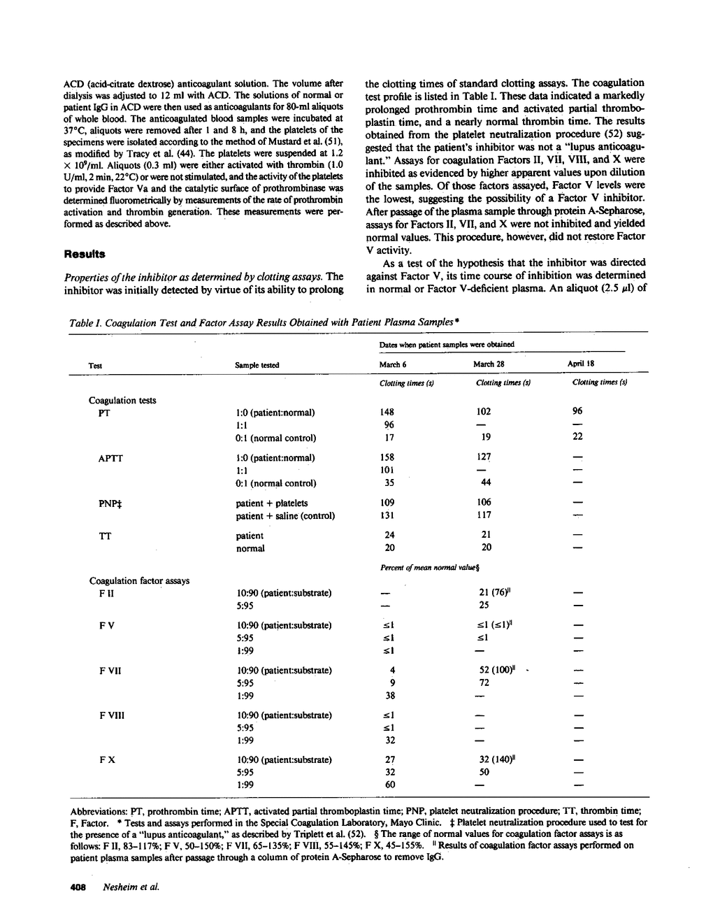 A coagulation Factor V inhibitor developed in a man 75 yr of age in association with an anaplastic malignancy and drug treatment (including the aminoglycoside antibiotic, gentamicin). The patient did not bleed abnormally, despite both surgical challenge and plasma Factor V activity of less than 1%. The inhibited plasma had grossly prolonged prothrombin and activated partial thromboplastin times, but a normal thrombin time. Mixing studies indicated progressive coagulation inhibition with normal plasma, but not with Factor V-deficient plasma, and reversal of coagulation inhibition by the addition of bovine Factor V to the patient's plasma. 1 ml of patient plasma inhibited the Factor V activity of 90 ml of normal human plasma. The inhibitor was isolated by sequential affinity chromatography on protein A-Sepharose and Factor V-Sepharose. The IgG isolate markedly inhibits the activity of prothrombinase assembled from purified Factors Xa and Va, calcium ion, and phospholipid vesicles, and partially inhibits prothrombinase assembled from purified Factor Xa, calcium ion, and normal platelets. The Factor V of platelets, however, appears relatively inaccessible to the antibody, inasmuch as platelets isolated from whole blood supplemented for 8 h with the antibody functioned normally with respect to platelet Factor V-mediated prothrombinase function. The absence of obvious hemorrhagic difficulties in the patient, the total inhibition of plasma Factor V by the inhibitor, and the apparent inaccessibility of platelet Factor V to the inhibitor specifically implicate platelet Factor V in the maintenance of hemostasis.