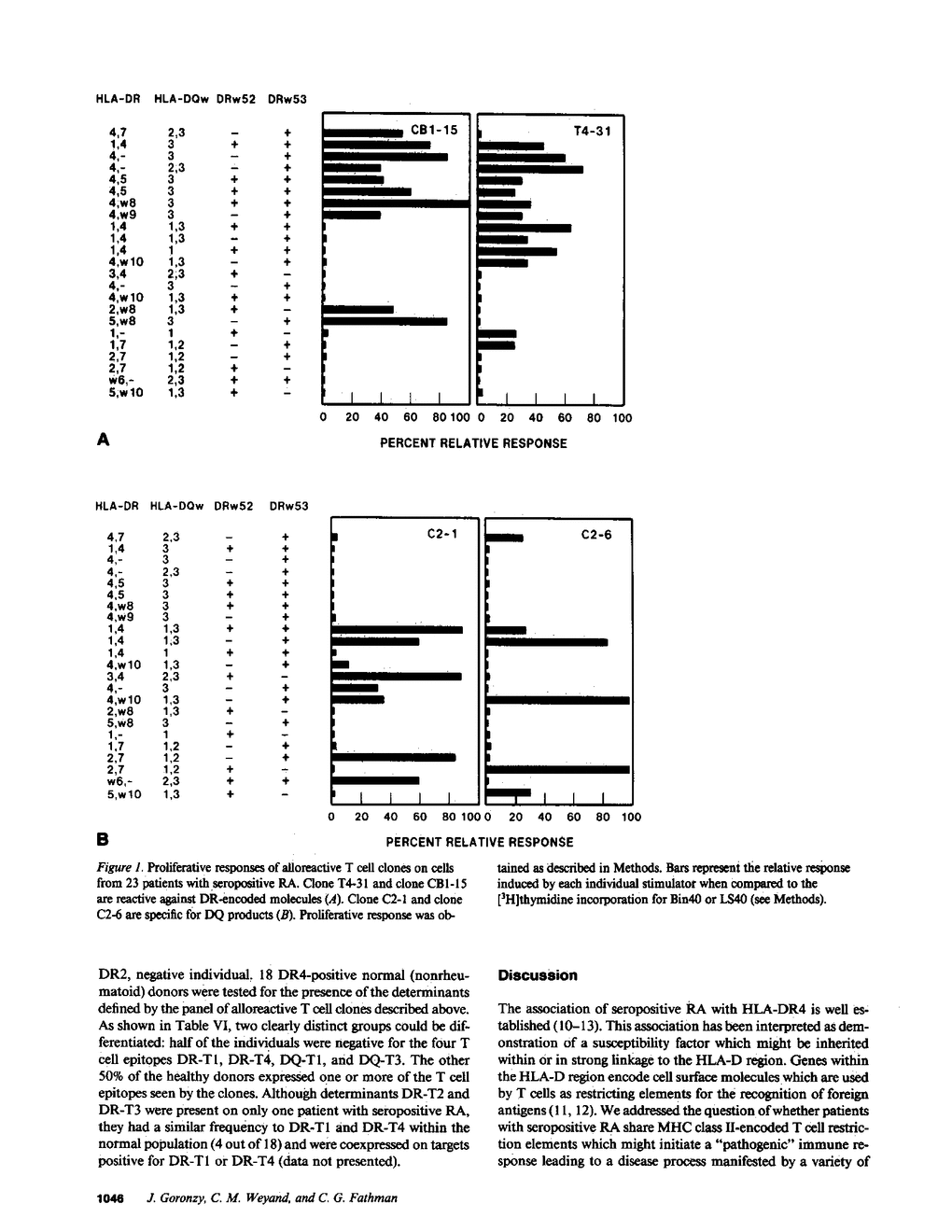 Seropositive rheumatoid arthritis (RA) in adult and juvenile patients is associated with the serologic marker HLA-DR4. This association is incomplete; about one-third of the patients lack the disease-associated HLA-DR4 haplotype. The main biological function of class II molecules is to restrict the recognition of antigen by T lymphocytes. We therefore tested the hypothesis that patients with seropositive RA share T cell recognition sites for an unknown antigen and that such T cell "epitopes" are not identified by conventional serologic typing. We generated alloreactive human T cell clones by stimulating peripheral blood lymphocytes of normal donors against a lymphoblastoid cell line from a juvenile patient with seropositive RA. A panel of clones that recognized only HLA-Dw14 cells on a panel of homozygous typing cells was used to analyze class II molecules of adult patients with seropositive RA. By inhibition studies using monoclonal antibodies, the epitopes recognized by the different clones could be further characterized and assigned either to DR- or to DQ-encoded cell surface products. By using four different clones, it was possible to identify Dw14-associated T cell epitopes on all seropositive rheumatoid patients tested who typed HLA-DR4-positive and also on all eight DR4-negative patients tested. Approximately one-half of nonrheumatoid DR4-positive donors carried one or more determinants recognized by these clones; the expression of these allodeterminants in DR4-negative nonrheumatoid patients was rare (less than 10%). Thus, alloreactive human T cell clones are powerful tools to define T cell recognition sites on class II molecules that are not identified by conventional typing. Using T cell clones with specificities for determinants expressed on Dw14 homozygous typing lines, we were able to demonstrate shared epitopes on cells of all patients tested with seropositive RA irrespective of their HLA-D or HLA-DR type. These data suggest that major histocompatibility complex class II antigens of RA patients might be much more homogeneous than demonstrated by the incomplete HLA-DR4 association.