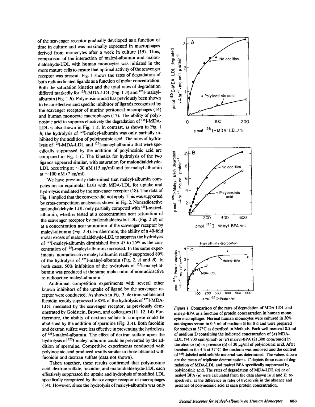 A comparison of the receptor-mediated interaction of malondialdehyde-low density lipoprotein and maleyl-albumin has been examined in human monocytes during differentiation in vitro. The recognition of both ligands by the scavenger receptor of these cells has been confirmed. We now report that human monocytes express a second cellular surface receptor for maleyl-albumin that is distinct from the scavenger receptor. The activity of the maleyl-albumin receptor, determined by both binding and lysosomal hydrolytic assays, substantially exceeds that of the scavenger receptor in freshly isolated monocytes. A dramatic and rapid decline in the activity of the maleyl-albumin receptor occurs within 72 to 96 h during differentiation in vitro. At day 7, while only 5-10% of the original activity of the maleyl-albumin receptor remains, it is similar to that of the maximally expressed scavenger receptor. Both the binding and hydrolysis of ligand mediated by the maleyl-albumin receptor are specifically inhibited by alpha-casein and alkaline-treated albumin; neither of these proteins is recognized by the scavenger receptor. The occurrence of the exceptionally active maleyl-albumin receptor on freshly isolated human monocytes suggests that it participates in processes necessary to the function of the cells that diminish in importance after differentiation of the monocytes into macrophages in vitro. Furthermore, while maleyl-albumin is a useful adjunct to studies of cellular events mediated by the scavenger receptor, the presence of a second receptor for maleyl-albumin must be taken into account as a potential contributing and complicating event.
