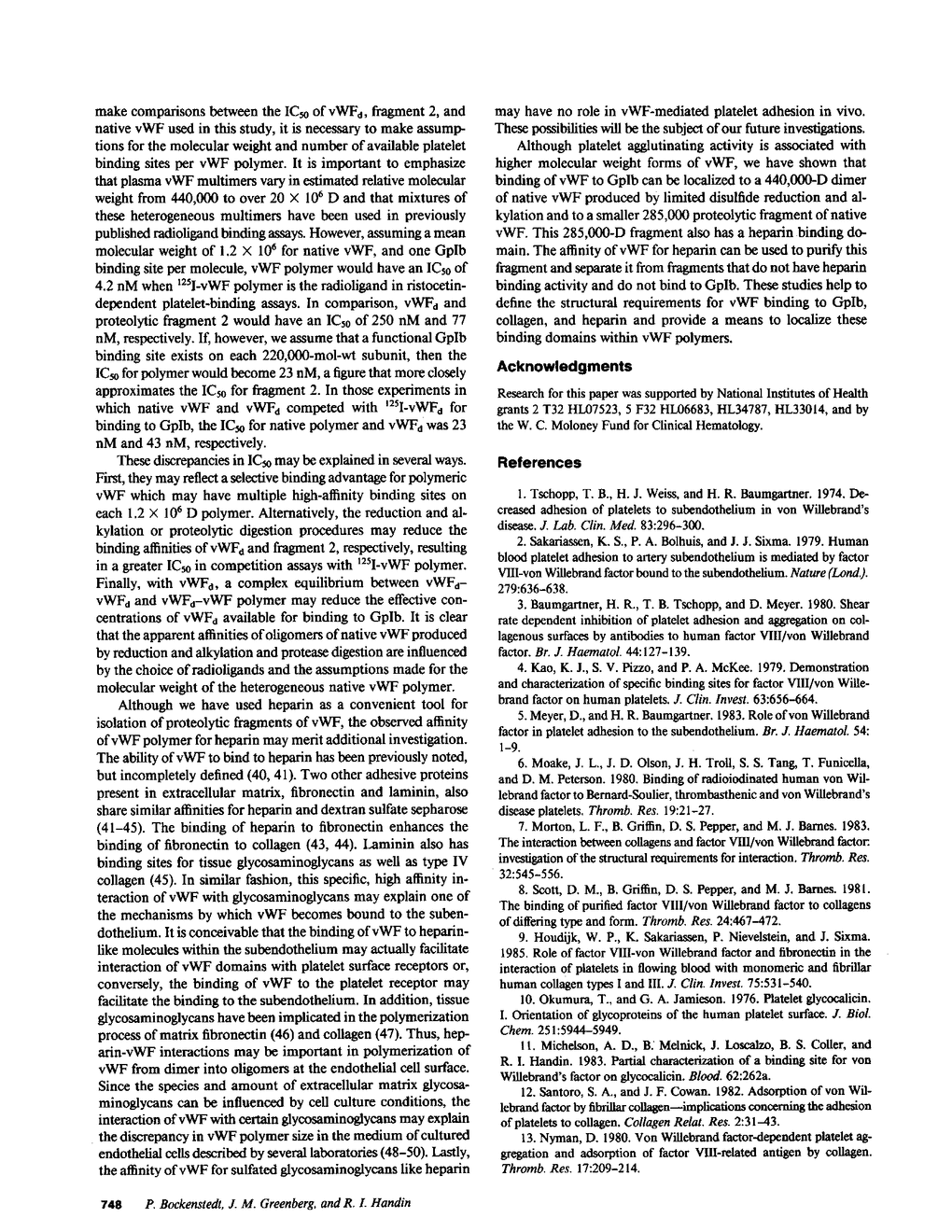 von Willebrand factor (vWF) is a large, multimeric glycoprotein that helps platelets adhere to vascular subendothelium. Although vWF binding to platelet receptors and connective tissue constituents is of fundamental importance in adhesion, there is little information regarding the nature of these vWF binding sites. In this paper, we have compared the structural requirements for vWF binding with platelet glycoprotein Ib (GpIb), heparin, and collagen and have shown that fragments derived from large vWF multimers retain biologic activity. We have shown that a 440,000-D subunit produced by disulfide reduction and alkylation of vWF polymer binds to platelet GpIb. When analyzed by polyacrylamide gel electrophoresis and Sepharose CL6B chromatography, the 440,000-D vWF oligomer is a dimer of the 220,000 subunit of fully reduced native vWF. This vWF dimer competes with 125I-vWF for binding to GpIb with an IC50 of 100 micrograms/ml (227 nM). The GpIb binding domain on vWF was further localized by digestion of native vWF polymers with Staphylococcal V8 protease. A 285,000-D fragment of vWF multimer was separated from heterogeneous 210,000-225,000-D fragments by its ability to bind to heparin. The 285,000-D fragment that bound to heparin Sepharose was composed of two disulfide-linked 175,000- and 115,000-D polypeptides. The heterogeneous fragments contained disulfide-linked 96,000, 66,000, and 53,000-D polypeptides when analyzed on polyacrylamide gel electrophoresis. The 285,000-D fragment competed with 125I-vWF for binding to GpIb with an IC50 of 22 micrograms/ml (77 nM), while the other fragments did not compete for binding. Neither the vWF dimer nor the proteolytic fragments competed with native 125I-vWF polymer for binding to collagen.