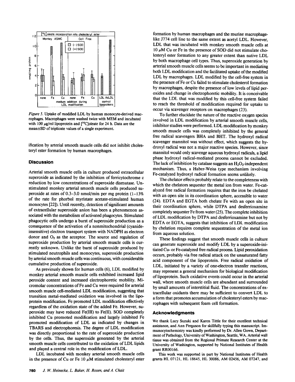 Extracellular superoxide was detected in cultures of monkey and human arterial smooth muscle cells as indicated by superoxide dismutase inhibitable reduction of cytochrome c. Superoxide production by these cells in the presence of Fe or Cu resulted in modification of low density lipoprotein (LDL). The degree of LDL modification was directly proportional to the rate of superoxide production by cells. Superoxide dismutase (100 micrograms/ml), and the general free radical scavengers butylated hydroxytoluene and butylated hydroxyanisole (50 microM), inhibited Fe- and Cu-mediated modification of LDL by monkey smooth muscle cells, while catalase (100 micrograms/ml) and mannitol (25 mM) had no effect. The chelators desferrioxamine and diethylenetriamine pentaacetic acid completely inhibited Fe- and Cu-promoted modification of LDL, while EGTA had no inhibitory effect. EDTA stimulated Fe-promoted modification in the 1-100 microM range while inhibiting Cu-mediated modification of LDL. LDL modified by smooth muscle cells in the presence of 10 microM Fe or Cu stimulated [14C]oleate incorporation into cholesteryl ester by human macrophages and murine J774 cells to a degree comparable to that produced by acetylated LDL. LDL incubated with smooth muscle cells and metal ions in the presence of superoxide dismutase failed to enhance macrophage cholesteryl ester accumulation. Thus, arterial smooth muscle cells in culture generate superoxide and modify LDL by a superoxide-dependent, Fe or Cu catalyzed free radical process, resulting in enhanced uptake of the modified LDL by macrophages. Neither hydroxyl radicals nor H2O2 are likely to be involved. Superoxide-dependent lipid peroxidation may contribute to biological modification of LDL, resulting in foam cell formation and atherogenesis.