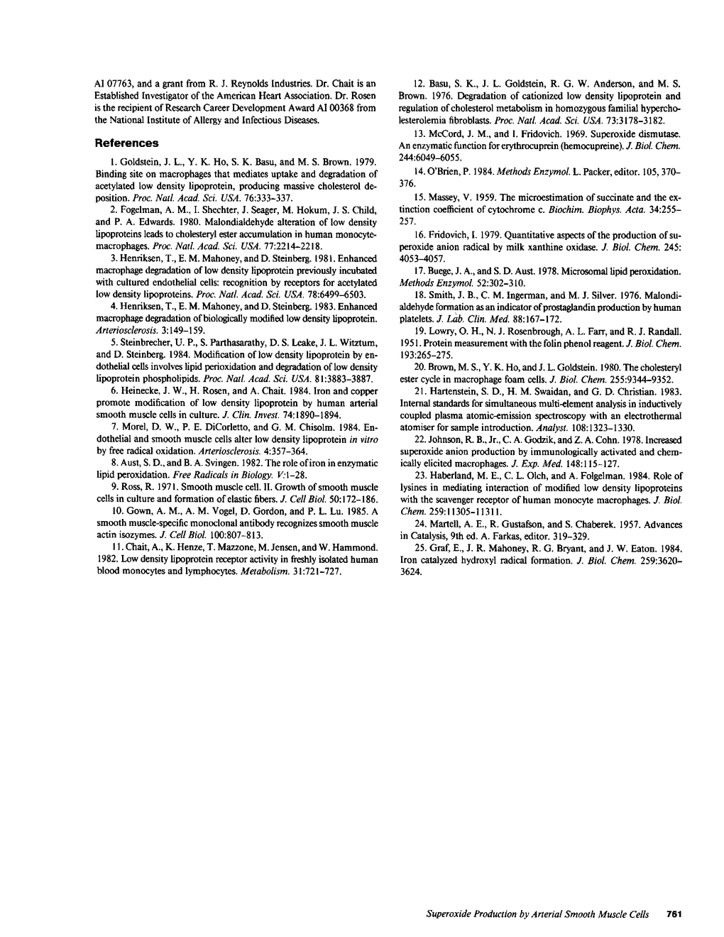 Extracellular superoxide was detected in cultures of monkey and human arterial smooth muscle cells as indicated by superoxide dismutase inhibitable reduction of cytochrome c. Superoxide production by these cells in the presence of Fe or Cu resulted in modification of low density lipoprotein (LDL). The degree of LDL modification was directly proportional to the rate of superoxide production by cells. Superoxide dismutase (100 micrograms/ml), and the general free radical scavengers butylated hydroxytoluene and butylated hydroxyanisole (50 microM), inhibited Fe- and Cu-mediated modification of LDL by monkey smooth muscle cells, while catalase (100 micrograms/ml) and mannitol (25 mM) had no effect. The chelators desferrioxamine and diethylenetriamine pentaacetic acid completely inhibited Fe- and Cu-promoted modification of LDL, while EGTA had no inhibitory effect. EDTA stimulated Fe-promoted modification in the 1-100 microM range while inhibiting Cu-mediated modification of LDL. LDL modified by smooth muscle cells in the presence of 10 microM Fe or Cu stimulated [14C]oleate incorporation into cholesteryl ester by human macrophages and murine J774 cells to a degree comparable to that produced by acetylated LDL. LDL incubated with smooth muscle cells and metal ions in the presence of superoxide dismutase failed to enhance macrophage cholesteryl ester accumulation. Thus, arterial smooth muscle cells in culture generate superoxide and modify LDL by a superoxide-dependent, Fe or Cu catalyzed free radical process, resulting in enhanced uptake of the modified LDL by macrophages. Neither hydroxyl radicals nor H2O2 are likely to be involved. Superoxide-dependent lipid peroxidation may contribute to biological modification of LDL, resulting in foam cell formation and atherogenesis.