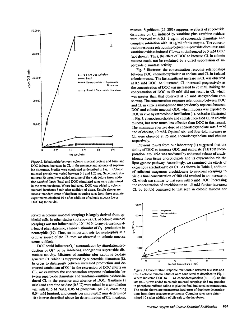 Our previous studies had suggested a link between bile salt stimulation of colonic epithelial proliferation and the release and oxygenation of arachidonate via the lipoxygenase pathway. In the present study, we examined the role of reactive oxygen versus end products of arachidonate metabolism via the cyclooxygenase and lipoxygenase pathways in bile salt stimulation of rat colonic epithelial proliferation. Intracolonic instillation of 5 mM deoxycholate increased mucosal ornithine decarboxylase activity and [3H]thymidine incorporation into DNA. Responses to deoxycholate were abolished by the superoxide dismutase mimetic CuII (3,5 diisopropylsalicylic acid)2 (CuDIPS), and by phenidone or esculetin, which inhibit both lipoxygenase and cyclooxygenase activities. By contrast, indomethacin potentiated the response. Phenidone and esculetin suppressed deoxycholate-induced increases in prostaglandin E2 (PGE2), leukotriene B4 (LTB4), and 5, 12, and 15-hydroxyeicosatetraenoic acid (HETE), whereas CuDIPS had no effect. Indomethacin suppressed only PGE2. Deoxycholate (0.5-5 mM) increased superoxide dismutase sensitive chemiluminescence 2-10-fold and stimulated superoxide production as measured by cytochrome c reduction in colonic mucosal scrapings or crypt epithelium. Bile salt-induced increases in chemiluminescence were abolished by CuDIPS, phenidone, and esculetin, but not by indomethacin. Intracolonic generation of reactive oxygen by xanthine-xanthine oxidase increased colonic mucosal ornithine decarboxylase activity and [3H]thymidine incorporation into DNA approximately twofold. These effects were abolished by superoxide dismutase. The findings support a key role for reactive oxygen, rather than more distal products of either the lipoxygenase or cyclooxygenase pathways, in the stimulation of colonic mucosal proliferation by bile salts.