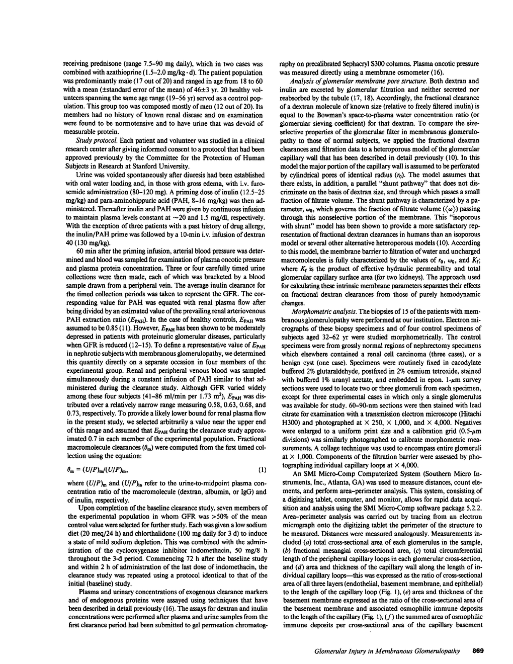 A differential solute clearance technique was used to evaluate glomerular capillary wall function in 20 patients with membranous glomerulopathy and massive proteinuria. The clearance of inulin, the filtration fraction, and the fractional clearance of uncharged dextrans of a radius of 28-48 A were depressed significantly below control values in 20 healthy volunteers (P less than 0.01). In contrast, the fractional clearance of dextrans of radius greater than 50 A was elevated markedly. A theoretical model of solute transport that depicts the major portion of the glomerular capillary wall as an isoporous membrane and the minor portion as a nondiscriminatory shunt pathway revealed the calculated glomerular ultrafiltration coefficient to be five times lower and mean pore radius of the major membrane component to be 4 A smaller than control values. However, the fraction of filtrate volume permeating the shunt pathway was three- to fourfold above control values and correlated strongly in individual patients with the fractional clearance of albumin (r = 0.76) and of IgG (r = 0.80). Lowering renal plasma flow by 24% during indomethacin therapy in seven patients resulted in a 74% reduction in proteinuria accompanied by a corresponding diminution of filtrate formed through the shunt pathway. Morphometric analysis of glomerular ultrastructure revealed the magnitude of depression of the glomerular filtration rate and of urinary protein leakage to be related strongly to changes in the epithelial layer of the glomerular capillary wall, but not to the density of subepithelial immune deposits. We conclude that glomerular capillaries in membranous glomerulopathy are characterized by a loss of ultrafiltration capacity and of barrier size-selectivity, and that subepithelial immune deposits do not provide a structural basis for these functional alterations.