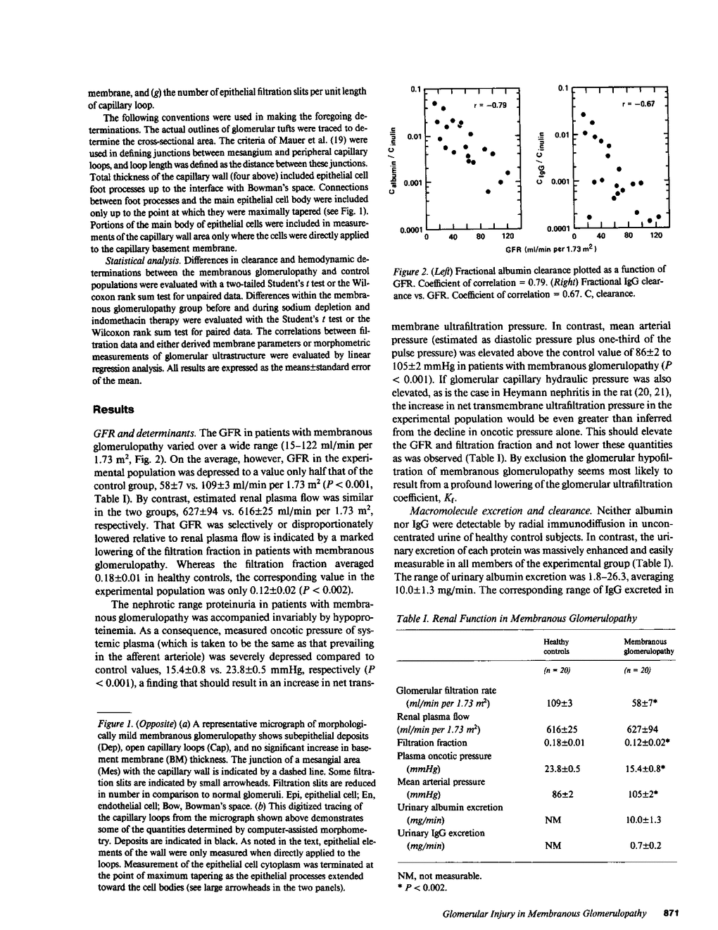 A differential solute clearance technique was used to evaluate glomerular capillary wall function in 20 patients with membranous glomerulopathy and massive proteinuria. The clearance of inulin, the filtration fraction, and the fractional clearance of uncharged dextrans of a radius of 28-48 A were depressed significantly below control values in 20 healthy volunteers (P less than 0.01). In contrast, the fractional clearance of dextrans of radius greater than 50 A was elevated markedly. A theoretical model of solute transport that depicts the major portion of the glomerular capillary wall as an isoporous membrane and the minor portion as a nondiscriminatory shunt pathway revealed the calculated glomerular ultrafiltration coefficient to be five times lower and mean pore radius of the major membrane component to be 4 A smaller than control values. However, the fraction of filtrate volume permeating the shunt pathway was three- to fourfold above control values and correlated strongly in individual patients with the fractional clearance of albumin (r = 0.76) and of IgG (r = 0.80). Lowering renal plasma flow by 24% during indomethacin therapy in seven patients resulted in a 74% reduction in proteinuria accompanied by a corresponding diminution of filtrate formed through the shunt pathway. Morphometric analysis of glomerular ultrastructure revealed the magnitude of depression of the glomerular filtration rate and of urinary protein leakage to be related strongly to changes in the epithelial layer of the glomerular capillary wall, but not to the density of subepithelial immune deposits. We conclude that glomerular capillaries in membranous glomerulopathy are characterized by a loss of ultrafiltration capacity and of barrier size-selectivity, and that subepithelial immune deposits do not provide a structural basis for these functional alterations.