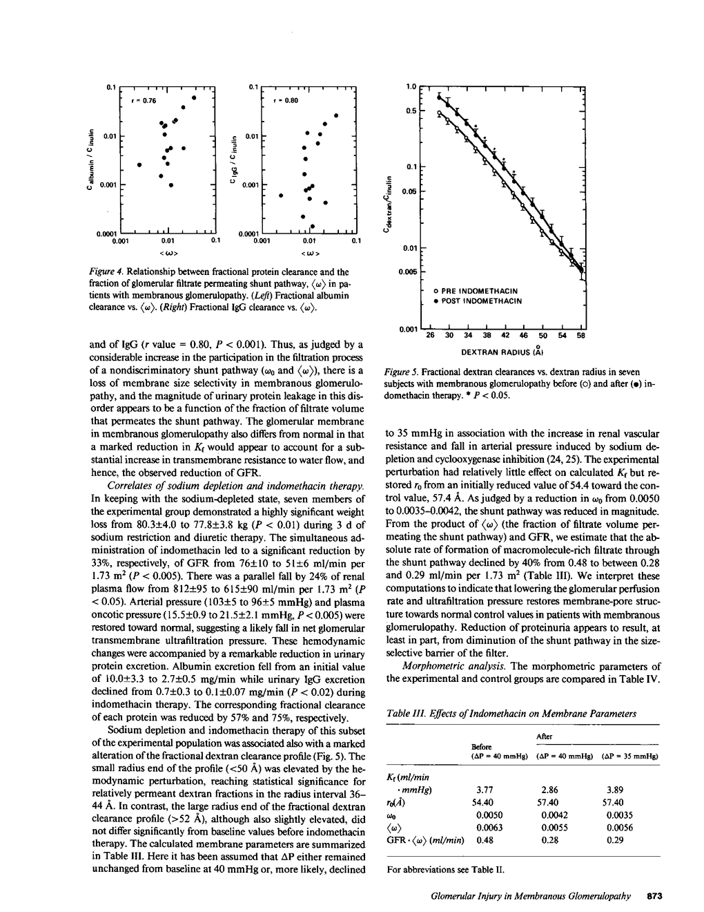 A differential solute clearance technique was used to evaluate glomerular capillary wall function in 20 patients with membranous glomerulopathy and massive proteinuria. The clearance of inulin, the filtration fraction, and the fractional clearance of uncharged dextrans of a radius of 28-48 A were depressed significantly below control values in 20 healthy volunteers (P less than 0.01). In contrast, the fractional clearance of dextrans of radius greater than 50 A was elevated markedly. A theoretical model of solute transport that depicts the major portion of the glomerular capillary wall as an isoporous membrane and the minor portion as a nondiscriminatory shunt pathway revealed the calculated glomerular ultrafiltration coefficient to be five times lower and mean pore radius of the major membrane component to be 4 A smaller than control values. However, the fraction of filtrate volume permeating the shunt pathway was three- to fourfold above control values and correlated strongly in individual patients with the fractional clearance of albumin (r = 0.76) and of IgG (r = 0.80). Lowering renal plasma flow by 24% during indomethacin therapy in seven patients resulted in a 74% reduction in proteinuria accompanied by a corresponding diminution of filtrate formed through the shunt pathway. Morphometric analysis of glomerular ultrastructure revealed the magnitude of depression of the glomerular filtration rate and of urinary protein leakage to be related strongly to changes in the epithelial layer of the glomerular capillary wall, but not to the density of subepithelial immune deposits. We conclude that glomerular capillaries in membranous glomerulopathy are characterized by a loss of ultrafiltration capacity and of barrier size-selectivity, and that subepithelial immune deposits do not provide a structural basis for these functional alterations.