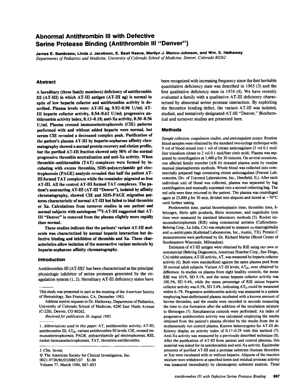 A hereditary (three family members) deficiency of antithrombin III (AT-III) in which AT-III antigen (AT-III ag) is normal in spite of low heparin cofactor and antithrombin activity is described. Plasma levels were: AT-III ag, 0.92-0.96 U/ml; AT-III heparin cofactor activity, 0.54-0.62 U/ml; progressive antithrombin activity index, 0.13-0.18; anti-Xa activity, 0.50-0.56 U/ml. Plasma crossed immunoelectrophoresis (CIE) patterns performed with and without added heparin were normal, but serum CIE revealed a decreased complex peak. Purification of the patient's plasma AT-III by heparin-sepharose affinity chromatography showed a normal protein recovery and elution profile, but the purified AT-III fraction showed only 50% of the normal progressive thrombin neutralization and anti-Xa activity. When thrombin-antithrombin (TAT) complexes were formed by incubating with excess thrombin, SDS-polyacrylamide gel electrophoresis (PAGE) analysis revealed that half the patient AT-III formed TAT complexes while the remainder migrated as free AT-III. All the control AT-III formed TAT complexes. The patient's nonreacting AT-III (AT-III "Denver"), isolated by affinity chromatography, showed CIE and SDS-PAGE migration patterns characteristic of normal AT-III but failed to bind thrombin or Xa. Calculations from turnover studies in one patient and normal subjects with autologous 131I-AT-III suggested that AT-III "Denver" is removed from the plasma slightly more rapidly than normal. These studies indicate that the patients' variant AT-III molecule was characterized by normal heparin interaction but defective binding and inhibition of thrombin and Xa. These characteristics allow isolation of the nonreactive variant molecule by heparin-sepharose affinity chromatography.