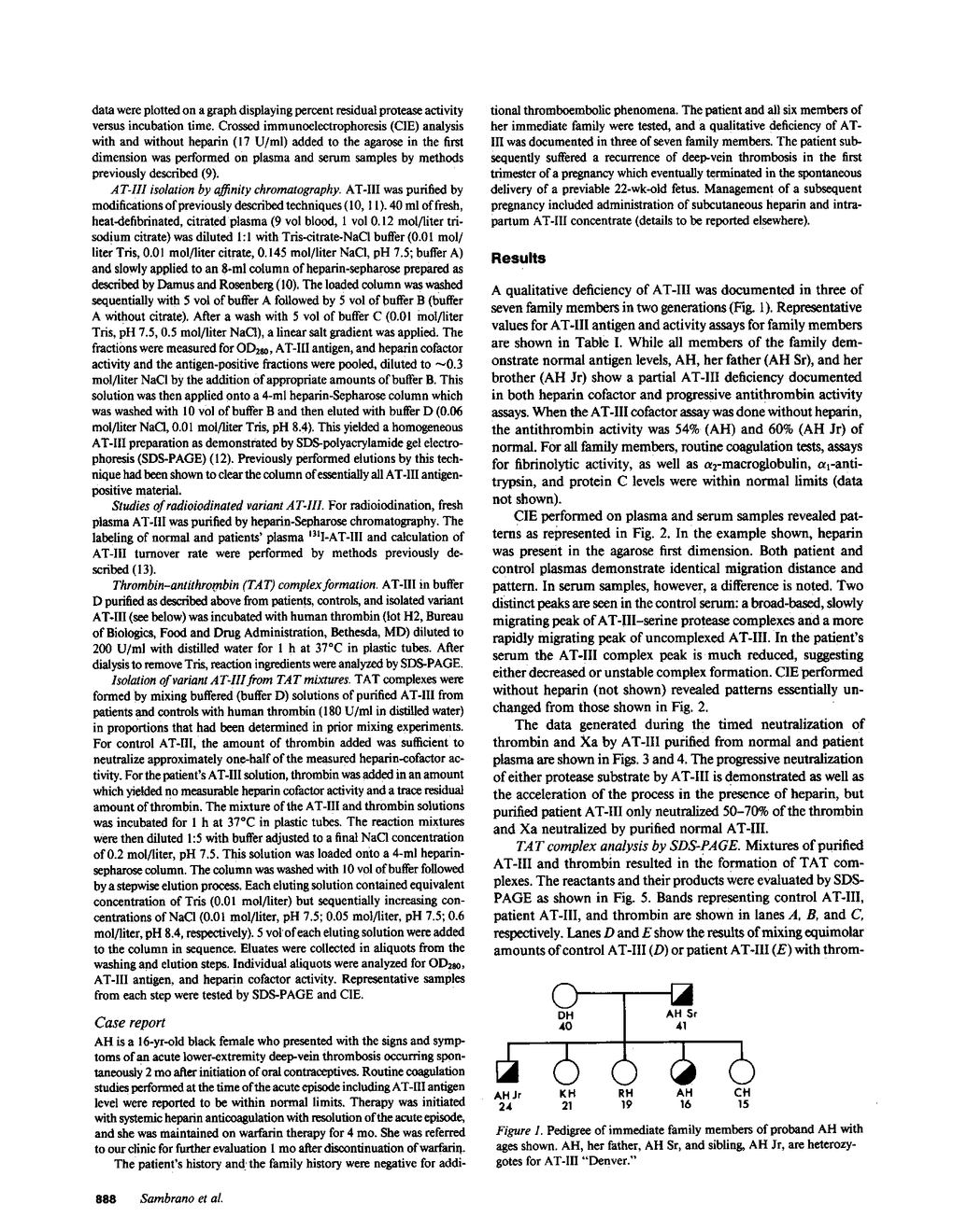 A hereditary (three family members) deficiency of antithrombin III (AT-III) in which AT-III antigen (AT-III ag) is normal in spite of low heparin cofactor and antithrombin activity is described. Plasma levels were: AT-III ag, 0.92-0.96 U/ml; AT-III heparin cofactor activity, 0.54-0.62 U/ml; progressive antithrombin activity index, 0.13-0.18; anti-Xa activity, 0.50-0.56 U/ml. Plasma crossed immunoelectrophoresis (CIE) patterns performed with and without added heparin were normal, but serum CIE revealed a decreased complex peak. Purification of the patient's plasma AT-III by heparin-sepharose affinity chromatography showed a normal protein recovery and elution profile, but the purified AT-III fraction showed only 50% of the normal progressive thrombin neutralization and anti-Xa activity. When thrombin-antithrombin (TAT) complexes were formed by incubating with excess thrombin, SDS-polyacrylamide gel electrophoresis (PAGE) analysis revealed that half the patient AT-III formed TAT complexes while the remainder migrated as free AT-III. All the control AT-III formed TAT complexes. The patient's nonreacting AT-III (AT-III "Denver"), isolated by affinity chromatography, showed CIE and SDS-PAGE migration patterns characteristic of normal AT-III but failed to bind thrombin or Xa. Calculations from turnover studies in one patient and normal subjects with autologous 131I-AT-III suggested that AT-III "Denver" is removed from the plasma slightly more rapidly than normal. These studies indicate that the patients' variant AT-III molecule was characterized by normal heparin interaction but defective binding and inhibition of thrombin and Xa. These characteristics allow isolation of the nonreactive variant molecule by heparin-sepharose affinity chromatography.