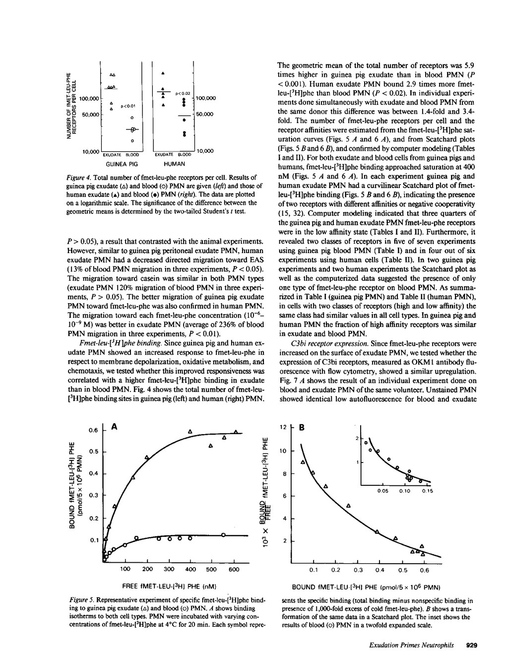 After circulating in the vascular system a short time, polymorphonuclear leukocytes (PMN) migrate to extravascular sites in response to chemotactic stimuli. Prestimulation of PMN in vitro by secretagogues has been shown to increase their number of N-formylmethionylleucylphenylalanine (fmet-leu-phe) and complement component C3bi (CR3) receptors. We investigated whether the same phenomenon occurred in vivo, comparing characteristics of human skin chamber and guinea pig peritoneal exudate and blood PMN. Exudate PMN of both species contained approximately 28% less of the specific granule marker vitamin B12-binding protein (P less than 0.01) but a similar amount of the azurophil granule marker beta-glucuronidase. The total number of fmet-leu-phe receptors was 5.9 times higher in guinea pig exudate than in blood PMN (P less than 0.01) and 2.9 times higher in human exudate than in blood PMN (P less than 0.02). All exudate PMN and most blood PMN preparations showed a high affinity receptor (Kd approximately 2.3 X 10(-8) M) and a low affinity receptor (approximately 1.5 X 10(-7) M). The upregulation of fmet-leu-phe receptors in exudate PMN correlated with an improved responsiveness to fmet-leu-phe induced membrane depolarization, oxidative metabolism, and chemotaxis. In addition, the concentration of fmet-leu-phe that produced a half-maximal response of chemotaxis, superoxide production, and membrane potential depolarization was 10-fold lower in exudate PMN than in blood PMN. Human exudate PMN had a twofold increased C3bi receptor expression compared with blood PMN. Thus, a preferential loss of specific granules is associated with increased number of high and low affinity fmet-leu-phe receptors and increased C3bi receptor expression not only in vitro, but also in vivo. The data indicate that exudation primes PMN for their subsequent responsiveness to fmet-leu-phe, a modification that may be crucial for efficient antimicrobial host defense.