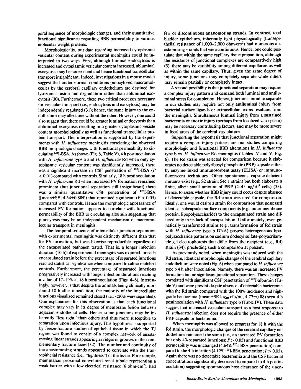 The cerebral capillary endothelium is unique and functions as an effective blood-brain barrier (BBB) owing to its intercellular tight junctions and rare pinocytotic vesicles. To assess how bacterial meningitis alters the BBB, rats were inoculated intracisternally with three encapsulated meningeal pathogens (Escherichia coli K1+, Streptococcus pneumoniae type III, Haemophilus influenzae type b) and an unencapsulated mutant strain (H. influenzae Rd). After defined infection durations, the morphologic alterations of the cerebral capillary endothelium were quantitatively assessed by transmission electron microscopy. Results revealed a significant increase in pinocytotic vesicle formation (P less than 0.001) early after meningitis induction (4 h) that was sustained with longer infection durations (10 h, 18 h) for all encapsulated strains tested. In addition, there was a progressive increase in completely separated intercellular junctions with increasing infection duration, (P less than 0.05). 4 h after induction of meningitis with H. influenzae Rd, cerebrospinal fluid (CSF) bacterial concentrations, cerebral capillary morphologic changes, and functional BBB permeability to circulating 125I-albumin were similar to those observed with H. influenzae type b. However, prolonging the H. influenzae Rd infection to 18 h allowed for CSF clearance of the organism, thereby precluding the significant increase in separated junctions or progression of functional BBB permeability seen with the encapsulated H. influenzae type b. These data suggest a uniform morphologic explanation for altered BBB permeability in meningitis with a reproducible temporal sequence. Encapsulation does not appear essential for BBB injury, but may facilitate its progression by allowing the organism to evade host clearance.