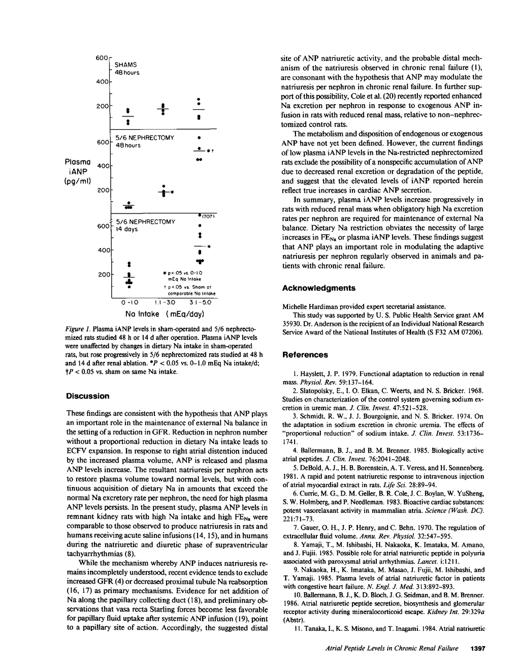 The kidney maintains constancy of body fluid volume by regulating urinary sodium (Na) excretion. In chronic renal failure, the reduction in glomerular filtration rate (GFR) is accompanied by an increase in Na excretion per nephron if dietary Na intake is not changed. Reduction in Na intake in proportion to reduced GFR obviates this adaptive increase in tubule Na excretion. To examine the potential role of endogenous atrial natriuretic peptide (ANP) in modulating the enhanced Na excretion per nephron in chronic renal failure, we studied rats subjected to 5/6 nephrectomy or sham operation on low, normal, and high Na intakes. Urinary Na excretion increased with increasing dietary Na in all groups, and Na excretion per nephron was increased in 5/6 nephrectomized rats as compared with sham-operated rats on the higher Na intakes. Plasma ANP levels were unaffected by dietary Na manipulations in sham-operated rats, but rose progressively in 5/6 nephrectomized rats with increasing Na intake. Despite extensive nephron reduction, however, plasma ANP levels failed to rise in uremic rats on low Na diets and in this group Na excretion per nephron also failed to rise. We conclude that enhanced ANP secretion may play an important role in promoting the adaptive increase in Na excretion per nephron in chronic renal failure. Restriction of dietary Na in the setting of reduced GFR obviates the stimulation of ANP secretion as well as the adaptive increase in Na excretion rate per nephron.
