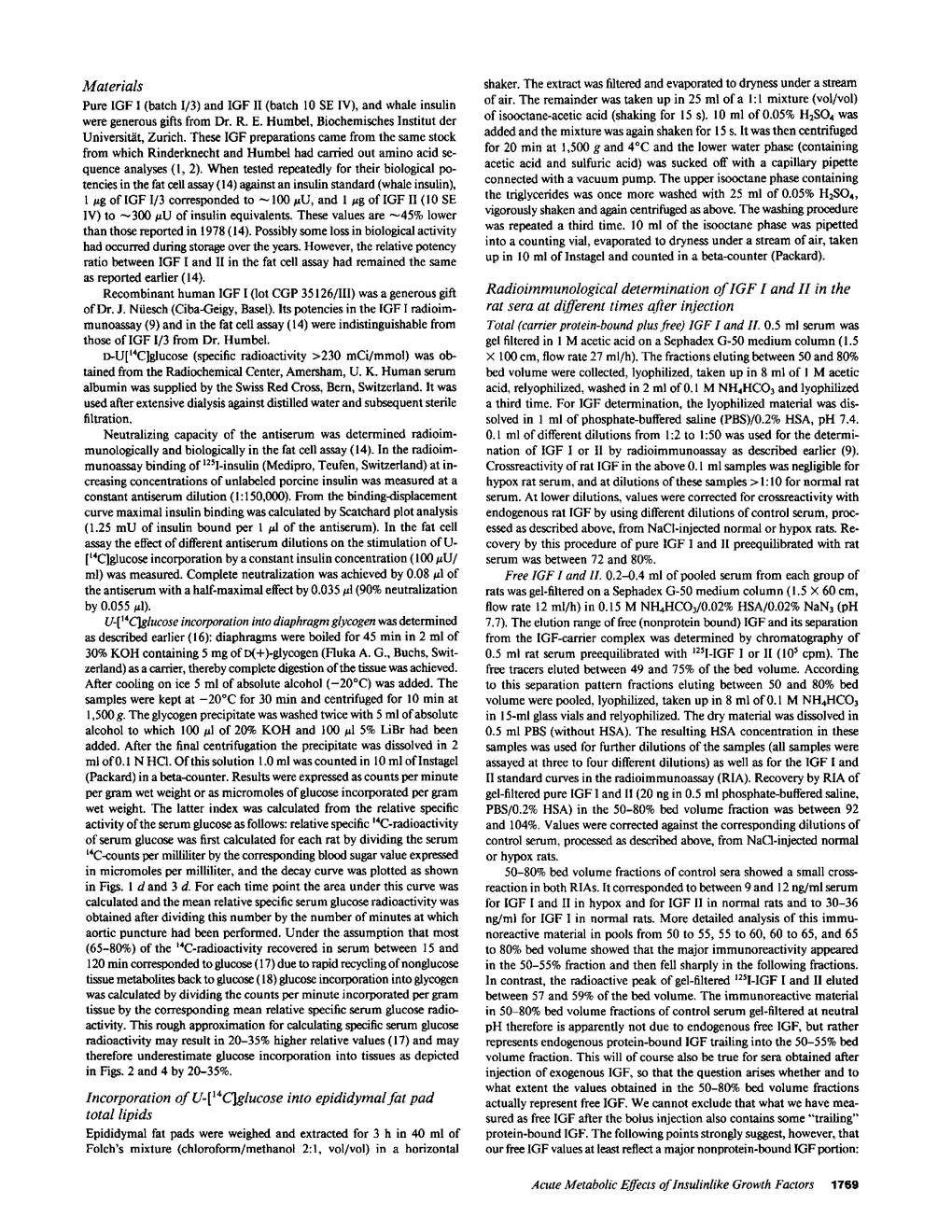 Insulinlike growth factors (IGF) act qualitatively like insulin on insulin target tissues in vitro. In the circulation in vivo they are bound to specific carrier proteins. In this form or when continuously infused into hypophysectomized (hypox) rats they do not exert acute insulinlike effects on glucose homeostasis. This study definitively shows that intravenous bolus injections of pure IGF I or II act acutely on glucose homeostasis: they lower the blood sugar, enhance the disappearance of U-[14C]glucose from serum and increase its incorporation into diaphragm glycogen in normal and hypox rats in the presence of antiinsulin serum. The same effects were obtained with recombinant human IGF I injected intravenously either with or without antiinsulin serum into normal rats. Free fatty acid levels decreased transiently only in normal animals. Lipid synthesis from glucose in adipose tissue was not stimulated in hypox and barely stimulated in normal rats. The half-life of injected IGF I or II in normal rats (approximately 4 h) is strikingly different from that in hypophysectomized rats (20-30 min) and appears to depend on the growth hormone-induced 150,000-200,000-mol wt IGF carrier protein that is lacking in hypophysectomized rats. 15 min after the bolus serum IGF I and II concentrations were similar to steady state levels during long-term infusion in hypox rats. Free IGF was barely detectable, however, in the infused animals, whereas 40-100% was found free 15 min after the bolus. These observations for the first time confirm the hypothesis that only free IGF, but not the IGF carrier protein complex, is bioavailable to insulin target tissues.