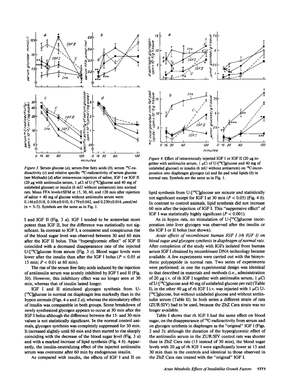 Insulinlike growth factors (IGF) act qualitatively like insulin on insulin target tissues in vitro. In the circulation in vivo they are bound to specific carrier proteins. In this form or when continuously infused into hypophysectomized (hypox) rats they do not exert acute insulinlike effects on glucose homeostasis. This study definitively shows that intravenous bolus injections of pure IGF I or II act acutely on glucose homeostasis: they lower the blood sugar, enhance the disappearance of U-[14C]glucose from serum and increase its incorporation into diaphragm glycogen in normal and hypox rats in the presence of antiinsulin serum. The same effects were obtained with recombinant human IGF I injected intravenously either with or without antiinsulin serum into normal rats. Free fatty acid levels decreased transiently only in normal animals. Lipid synthesis from glucose in adipose tissue was not stimulated in hypox and barely stimulated in normal rats. The half-life of injected IGF I or II in normal rats (approximately 4 h) is strikingly different from that in hypophysectomized rats (20-30 min) and appears to depend on the growth hormone-induced 150,000-200,000-mol wt IGF carrier protein that is lacking in hypophysectomized rats. 15 min after the bolus serum IGF I and II concentrations were similar to steady state levels during long-term infusion in hypox rats. Free IGF was barely detectable, however, in the infused animals, whereas 40-100% was found free 15 min after the bolus. These observations for the first time confirm the hypothesis that only free IGF, but not the IGF carrier protein complex, is bioavailable to insulin target tissues.