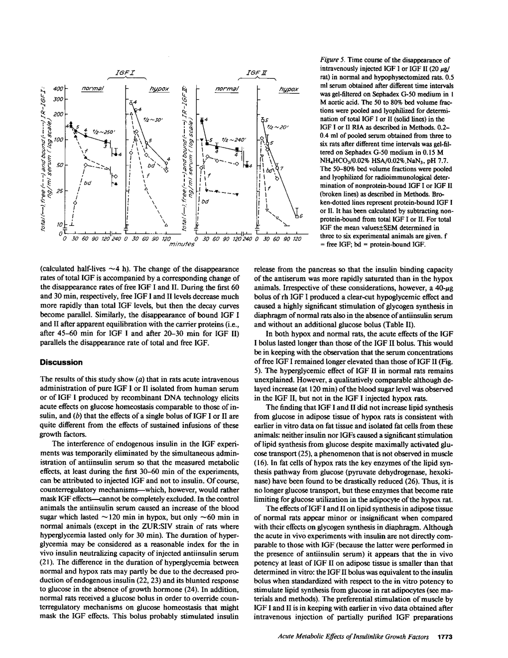 Insulinlike growth factors (IGF) act qualitatively like insulin on insulin target tissues in vitro. In the circulation in vivo they are bound to specific carrier proteins. In this form or when continuously infused into hypophysectomized (hypox) rats they do not exert acute insulinlike effects on glucose homeostasis. This study definitively shows that intravenous bolus injections of pure IGF I or II act acutely on glucose homeostasis: they lower the blood sugar, enhance the disappearance of U-[14C]glucose from serum and increase its incorporation into diaphragm glycogen in normal and hypox rats in the presence of antiinsulin serum. The same effects were obtained with recombinant human IGF I injected intravenously either with or without antiinsulin serum into normal rats. Free fatty acid levels decreased transiently only in normal animals. Lipid synthesis from glucose in adipose tissue was not stimulated in hypox and barely stimulated in normal rats. The half-life of injected IGF I or II in normal rats (approximately 4 h) is strikingly different from that in hypophysectomized rats (20-30 min) and appears to depend on the growth hormone-induced 150,000-200,000-mol wt IGF carrier protein that is lacking in hypophysectomized rats. 15 min after the bolus serum IGF I and II concentrations were similar to steady state levels during long-term infusion in hypox rats. Free IGF was barely detectable, however, in the infused animals, whereas 40-100% was found free 15 min after the bolus. These observations for the first time confirm the hypothesis that only free IGF, but not the IGF carrier protein complex, is bioavailable to insulin target tissues.