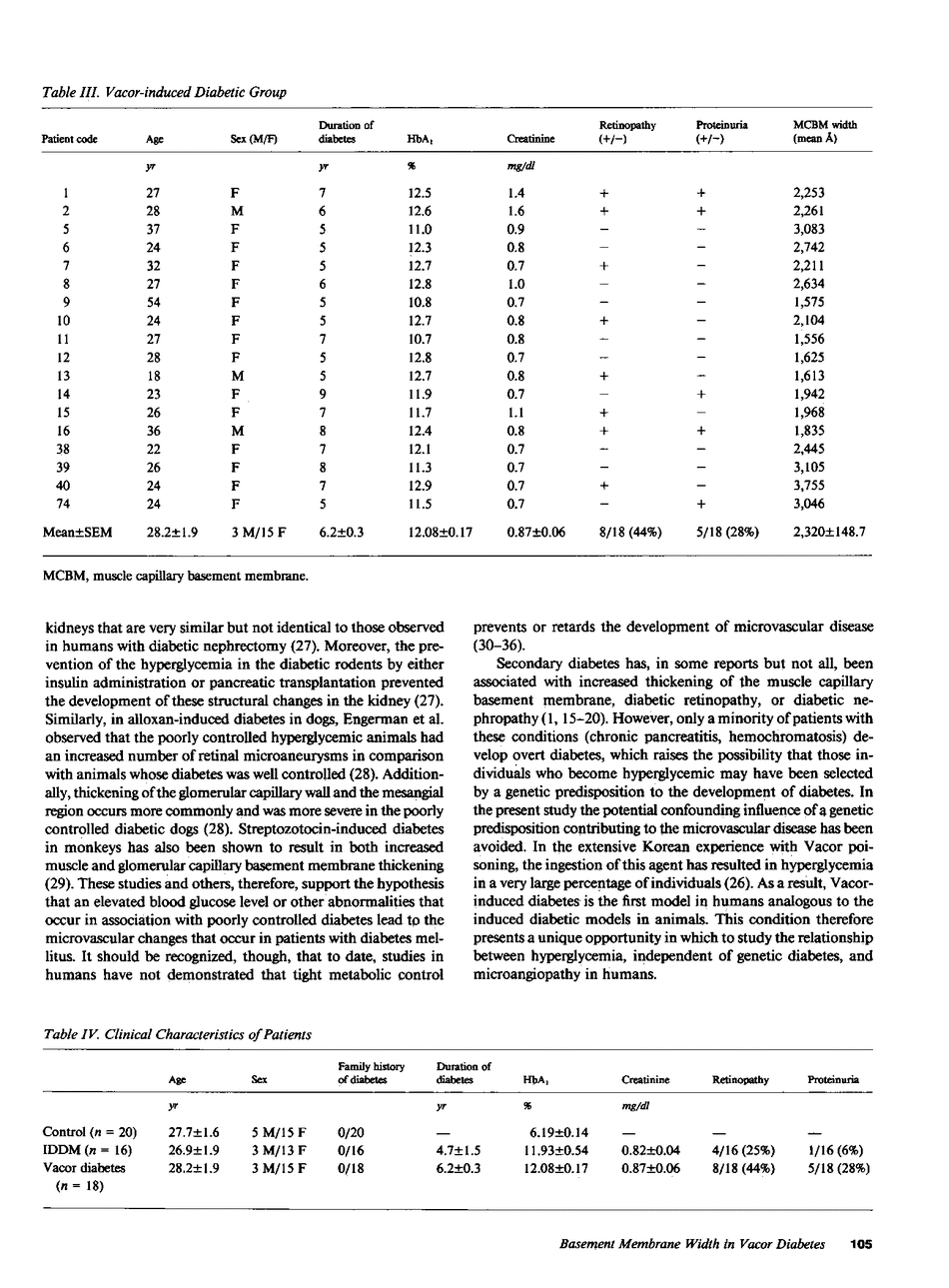 Muscle capillary basement membrane width is a sensitive marker for the presence of diabetic microangiopathy. Studies have indicated that genetic factors and alterations in glucose metabolism influence muscle capillary basement membrane width. To define the role of these factors we have measured muscle capillary basement membrane thickness in controls, insulin dependent diabetics, and individuals with diabetes secondary to the ingestion of Vacor, a rat poison, which results in hyperglycemia. Hemoglobin A1 concentrations were increased in both diabetic groups, but hemoglobin A1 levels and the duration of diabetes were similar in the two diabetic groups. The muscle capillary basement membrane width was increased to a similar extent in the insulin-dependent diabetics (control, 1,781 +/- 46 vs. IDD, 2,287 +/- 144 A, P less than 0.001) and in the Vacor diabetic group (2,320 +/- 149 A, P less than 0.001). In the insulin-dependent diabetic group, 63% of the patients had a muscle capillary basement membrane width greater than two standard deviations above the mean of the controls, while in the Vacor diabetic group this figure was 56%. Despite the relatively short duration of diabetes (6.2 +/- 0.3 yr), 44% of the Vacor diabetic patients had retinopathy and 28% had proteinuria. The present study provides strong evidence that even in the absence of genetic diabetes mellitus, hyperglycemia or some other abnormality related to insulin lack can cause microvascular changes.