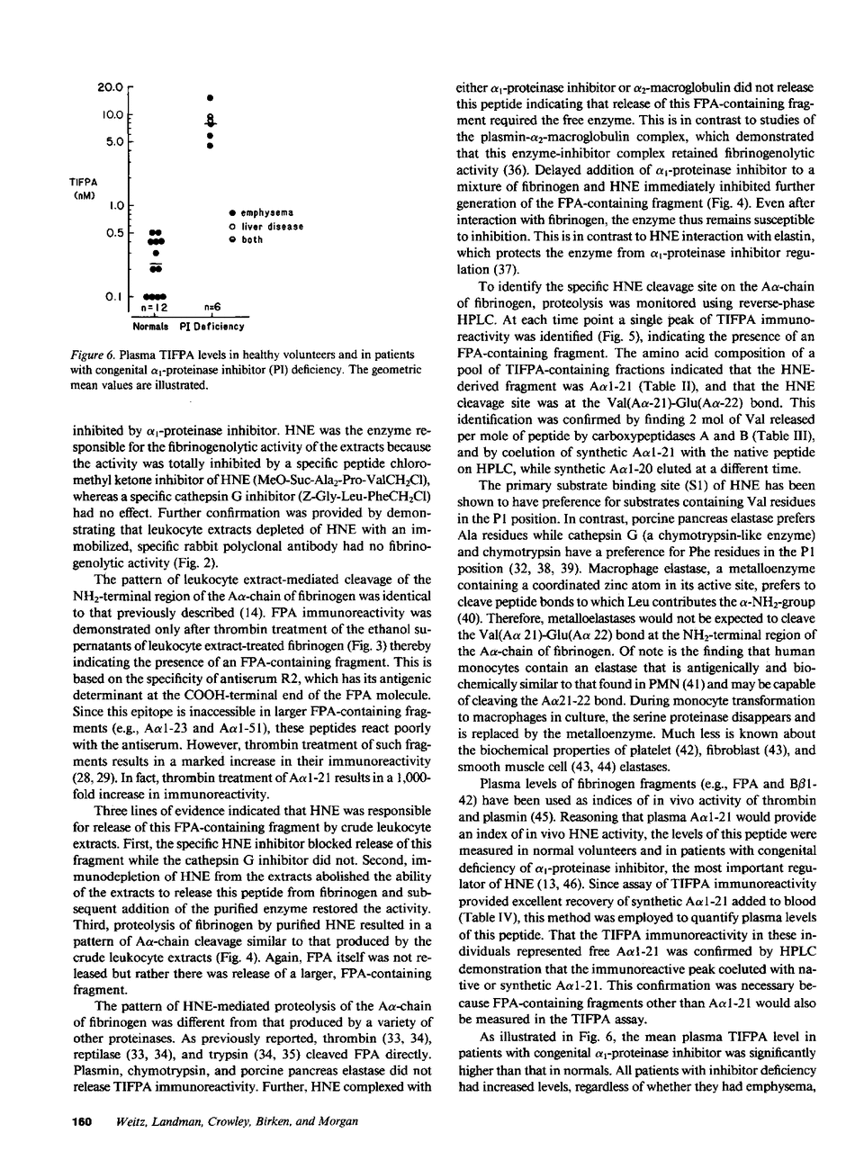 Leukocyte extracts contain enzymes that digest fibrinogen and release a fibrinopeptide A-containing fragment. This study was undertaken to identify the responsible proteinase and to characterize the fibrinopeptide A-containing fragment so that it could be used as an index of enzyme activity. Both the fibrinogenolytic activity and the release of the fibrinopeptide A-containing fragment mediated by the leukocyte extracts were shown to be due to human neutrophil elastase (HNE) by the following criteria: activity was completely blocked by a specific HNE inhibitor or by adsorbing HNE from the extracts with a monospecific antibody and reconstitution with purified HNE restored the ability to release the fibrinopeptide A-containing fragment. This fragment was not released by a variety of other proteinases or by HNE-inhibitor complexes indicating that, at least with respect to the enzymes tested, it is a specific product of HNE and its release requires the free enzyme. By separating the products of HNE digestion of fibrinogen using high performance liquid chromatography, identifying the immunoreactive fractions and subjecting them to amino acid analysis, the fragment was identified as A alpha 1-21, indicating an HNE cleavage site at the Val(A alpha 21)-Glu(A alpha 22) bond. The mean plasma A alpha 1-21 level was markedly higher in patients with alpha 1-proteinase inhibitor deficiency as compared to healthy controls (0.2 nM vs. 7.9 nM; P less than 0.0001), consistent with increased in vivo HNE activity in these individuals.
