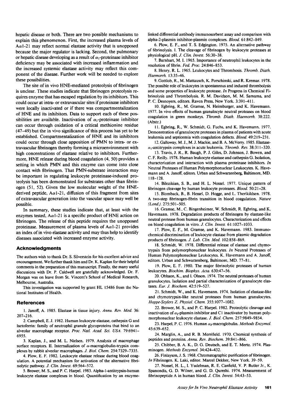 Leukocyte extracts contain enzymes that digest fibrinogen and release a fibrinopeptide A-containing fragment. This study was undertaken to identify the responsible proteinase and to characterize the fibrinopeptide A-containing fragment so that it could be used as an index of enzyme activity. Both the fibrinogenolytic activity and the release of the fibrinopeptide A-containing fragment mediated by the leukocyte extracts were shown to be due to human neutrophil elastase (HNE) by the following criteria: activity was completely blocked by a specific HNE inhibitor or by adsorbing HNE from the extracts with a monospecific antibody and reconstitution with purified HNE restored the ability to release the fibrinopeptide A-containing fragment. This fragment was not released by a variety of other proteinases or by HNE-inhibitor complexes indicating that, at least with respect to the enzymes tested, it is a specific product of HNE and its release requires the free enzyme. By separating the products of HNE digestion of fibrinogen using high performance liquid chromatography, identifying the immunoreactive fractions and subjecting them to amino acid analysis, the fragment was identified as A alpha 1-21, indicating an HNE cleavage site at the Val(A alpha 21)-Glu(A alpha 22) bond. The mean plasma A alpha 1-21 level was markedly higher in patients with alpha 1-proteinase inhibitor deficiency as compared to healthy controls (0.2 nM vs. 7.9 nM; P less than 0.0001), consistent with increased in vivo HNE activity in these individuals.