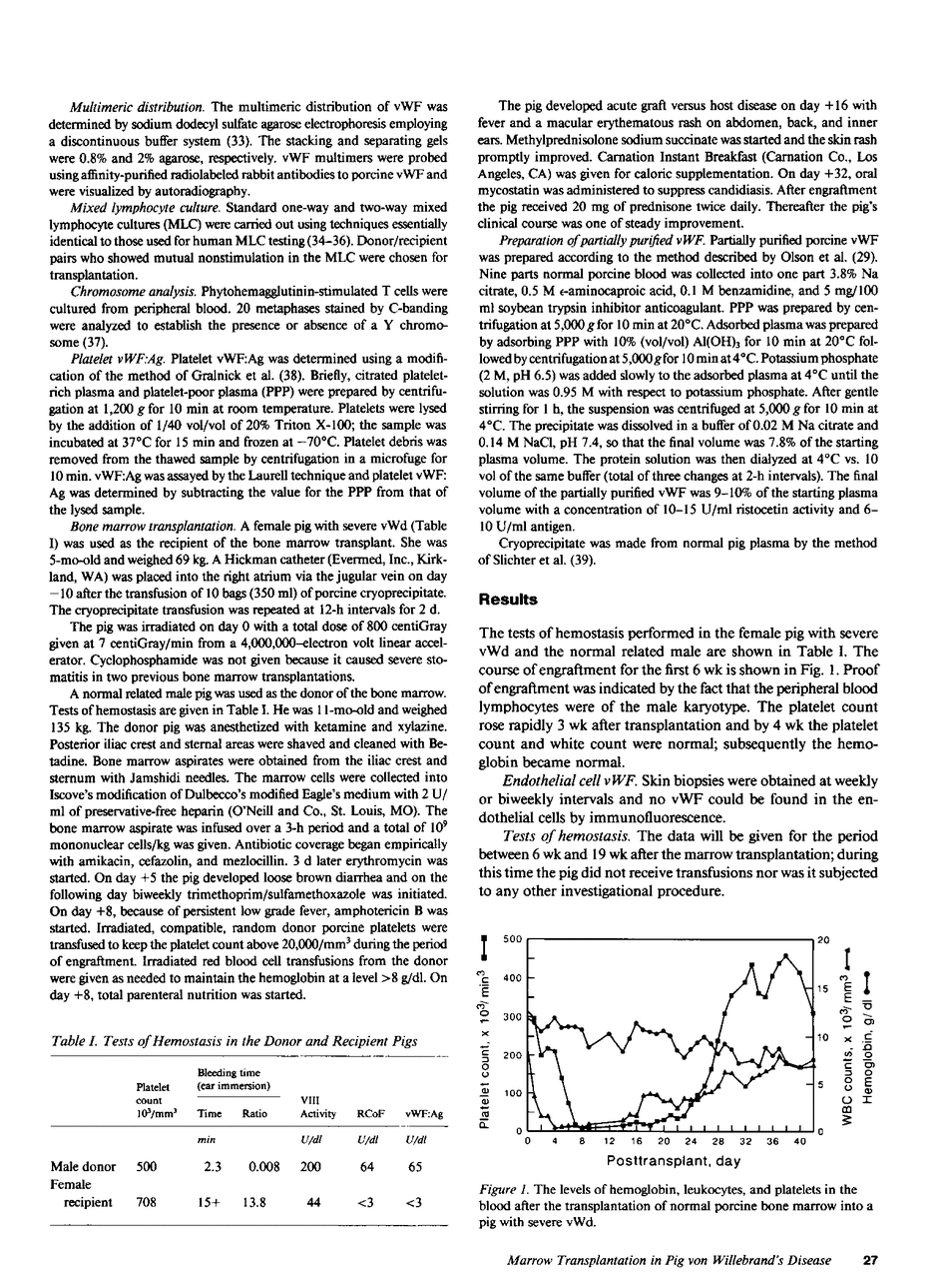 Bone marrow from a normal male pig was transplanted into a related female pig with severe homozygous von Willebrand's disease (vWd). After engraftment the circulating leukocytes were of the male karyotype, and the platelets were strongly positive for von Willebrand factor (vWF) by indirect immunofluorescence. The average level of vWF was 1.96 U/dl and of ristocetin cofactor was 2.8 U/dl. The ear immersion bleeding time before transplantation was consistently more than 15 min and afterwards varied between 5 min and more than 15 min. Transfused vWF corrected the bleeding time at a level of 10 U/dl, which is lower than that required for a von Willebrand pig. We concluded that: the plasmatic compartment is only minimally replenished by the vWF from platelets and megakaryocytes; and the platelet vWF alone only partially corrects the abnormal tests of the hemostatic mechanism in severe vWd.