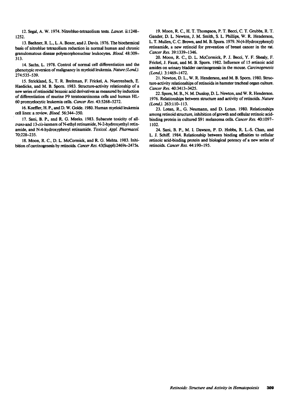Retinoids were studied both to identify what skeletal components are important in the modulation of normal and leukemic human myeloid clonal proliferation and differentiation in vitro and to elucidate the mechanism by which retinoids modulate proliferation of hematopoietic cells. Retinoids with a derivatized terminal carboxyl group were significantly less active than all-trans-retinoic acid, and those with the addition of two methyl groups to the cyclohexenyl ring of retinoic acid or substitution of its beta-cyclogeranylidene group with a 1,1,3,3-5-indanyl ring system were markedly more active than all-trans-retinoic acid. Five of the retinoids strongly inhibited clonal growth of the HL-60 and KG-1 human leukemic cell lines (50% inhibition in the range of 3 X 10(-10)-1 X 10(-8) M) and markedly stimulated normal human myeloid colony formation (granulocyte-macrophage colony-forming cells [GM-CFC] 150% stimulation in the range of 3 X 10(-9)-3 X 10(-8) M). Further studies suggested that: Common structural requirements of the retinoids were important in the modulation of both normal and leukemic hematopoiesis. The retinoids were able to inhibit leukemic proliferation without induction of differentiation of the neoplastic cells. Studies on normal human GM-CFC suggested that the retinoids did not act by themselves as a colony-stimulating factor (CSF), or by stimulating accessory cells to produce CSF, but either required earlier progenitor cells to become GM-CFC or enhanced the sensitivity of GM-CFC to the action of CSF.