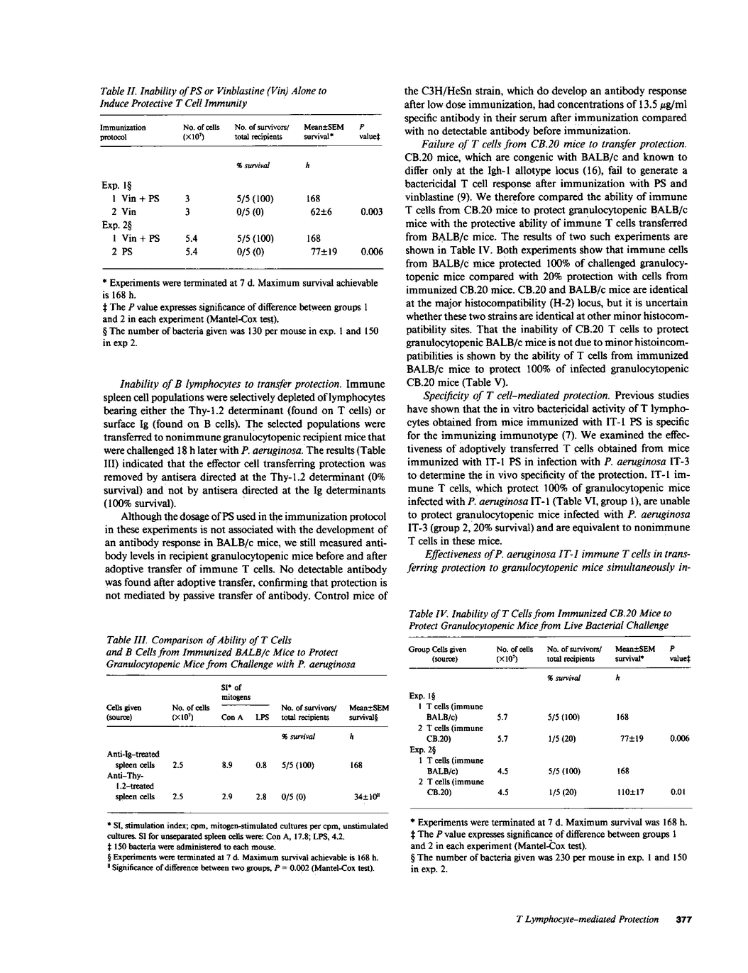 BALB/c mice immunized with Pseudomonas aeruginosa immunotype 1 polysaccharide develop protective T cell immunity to bacterial challenge. In vitro, T cells from immunized mice kill P. aeruginosa by production of a bactericidal lymphokine. The present study demonstrates that adoptive transfer of T cells from immunized BALB/c mice to granulocytopenic mice resulted in 97% survival on challenge with P. aeruginosa, compared with 17% survival with adoptive transfer of T cells from nonimmune BALB/c mice. This protection is specifically elicited by reexposure to the original immunizing antigen; adoptive recipients cannot withstand challenge with immunotype 3 P. aeruginosa. However, the adoptive recipients do survive simultaneous infection with both P. aeruginosa immunotypes 1 and 3. Adoptive transfer of T cells from the congenic CB.20 mice, which are unable to kill P. aeruginosa in vitro, provides only 20% protection to granulocytopenic mice. These studies indicate that transfer of specific immune T lymphocytes can significantly enhance the resistance to P. aeruginosa infection in granulocytopenic mice.