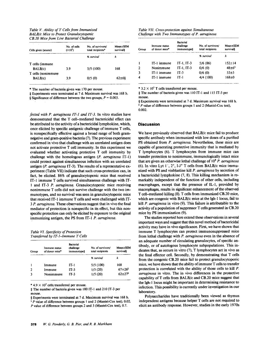 BALB/c mice immunized with Pseudomonas aeruginosa immunotype 1 polysaccharide develop protective T cell immunity to bacterial challenge. In vitro, T cells from immunized mice kill P. aeruginosa by production of a bactericidal lymphokine. The present study demonstrates that adoptive transfer of T cells from immunized BALB/c mice to granulocytopenic mice resulted in 97% survival on challenge with P. aeruginosa, compared with 17% survival with adoptive transfer of T cells from nonimmune BALB/c mice. This protection is specifically elicited by reexposure to the original immunizing antigen; adoptive recipients cannot withstand challenge with immunotype 3 P. aeruginosa. However, the adoptive recipients do survive simultaneous infection with both P. aeruginosa immunotypes 1 and 3. Adoptive transfer of T cells from the congenic CB.20 mice, which are unable to kill P. aeruginosa in vitro, provides only 20% protection to granulocytopenic mice. These studies indicate that transfer of specific immune T lymphocytes can significantly enhance the resistance to P. aeruginosa infection in granulocytopenic mice.