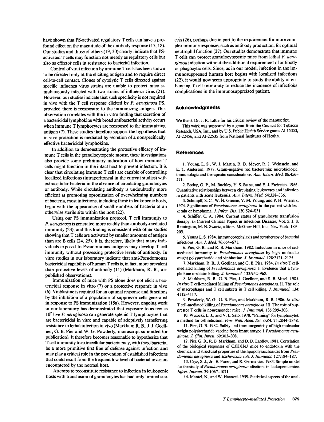 BALB/c mice immunized with Pseudomonas aeruginosa immunotype 1 polysaccharide develop protective T cell immunity to bacterial challenge. In vitro, T cells from immunized mice kill P. aeruginosa by production of a bactericidal lymphokine. The present study demonstrates that adoptive transfer of T cells from immunized BALB/c mice to granulocytopenic mice resulted in 97% survival on challenge with P. aeruginosa, compared with 17% survival with adoptive transfer of T cells from nonimmune BALB/c mice. This protection is specifically elicited by reexposure to the original immunizing antigen; adoptive recipients cannot withstand challenge with immunotype 3 P. aeruginosa. However, the adoptive recipients do survive simultaneous infection with both P. aeruginosa immunotypes 1 and 3. Adoptive transfer of T cells from the congenic CB.20 mice, which are unable to kill P. aeruginosa in vitro, provides only 20% protection to granulocytopenic mice. These studies indicate that transfer of specific immune T lymphocytes can significantly enhance the resistance to P. aeruginosa infection in granulocytopenic mice.
