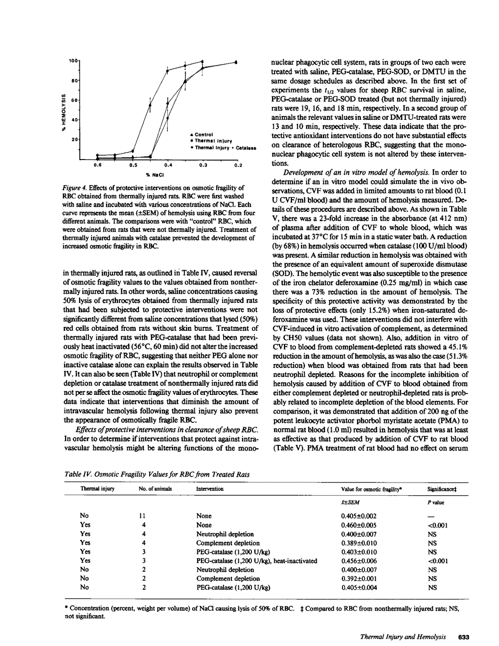 Acute thermal injury of rat skin produces an early, acute hemoglobinemia that is associated with the presence in blood of osmotically fragile red cells (RBC) that do not contain on their surfaces measurable amounts of complement components. The hemoglobinemia and the appearance in blood of osmotically fragile RBC appear to be the result of complement activation, which leads to oxygen radical production by neutrophils and damage of RBC. This has been demonstrated in vitro as well as in vivo by the ability of antioxidant interventions or neutrophil or complement depletion procedures to prevent the appearance of osmotically fragile RBC and the release of hemoglobin. These data may be relevant to the complications of hemoglobinemia and hemoglobinuria accompanying thermal injury in humans.