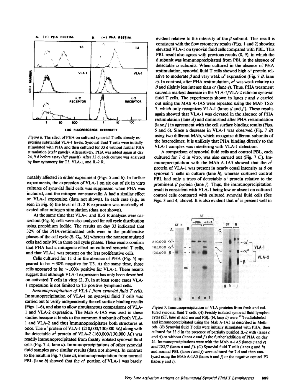 Lymphocytes from the synovial fluid of eight out of eight rheumatoid arthritis (RA) patients had elevated very late activation antigen-1 (VLA-1) expression (10-36% positive cells), whereas peripheral blood lymphocytes (PBL) from RA patients and healthy controls had low VLA-1 expression (0-6% positive cells). During 1-2 wk of in vitro culture, VLA-1 increased on synovial fluid cells but remained low on PBL. In comparison, the interleukin 2 receptor (IL-2 R) was less prominent than VLA-1 on fresh synovial fluid cells, did not increase on cultured synovial fluid T cells, but did increase greatly on cultured PBL. The mitogen PHA reversed or prevented the appearance of VLA-1+, IL-2 R- synovial fluid cells during in vitro culture, thus giving IL-2 R+, VLA-1- cells. These results emphasize that VLA-1+ SF cells are different from resting cells or IL-2 R+ activated PBL T cells, and VLA-1 on synovial fluid T cells may be incompatible with mitogen stimulation. In addition, the VLA-2 heterodimer (165,000/130,000 relative molecular mass [Mr]) was regulated opposite to the VLA-1 heterodimer (130,000/210,000 Mr) on synovial lymphocytes, and thus the VLA-1/VLA-2 ratio is another indicator of the stage of T cell activation.
