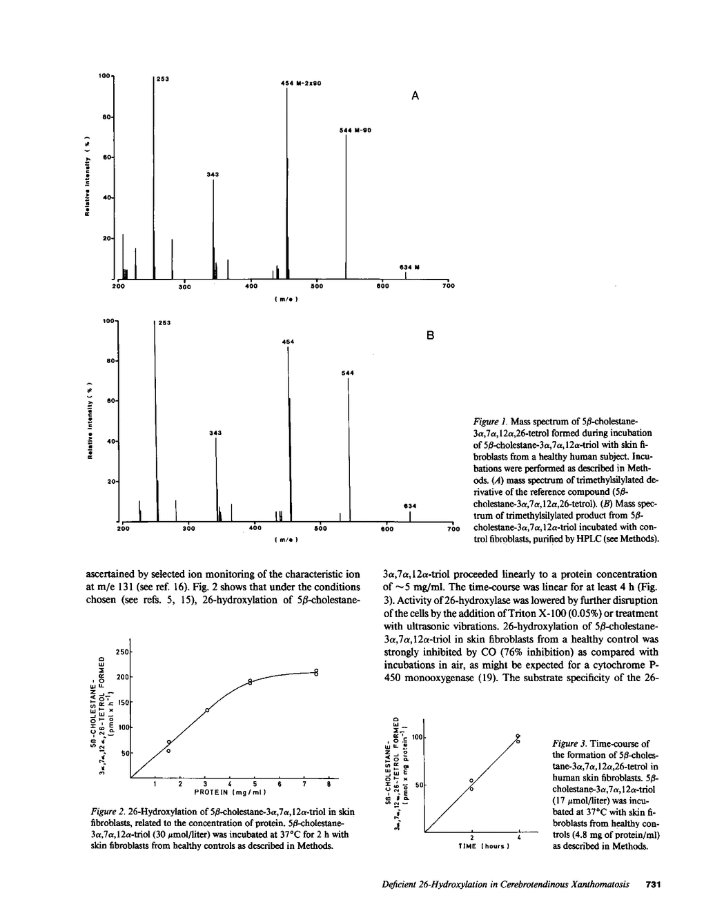 26-Hydroxylation of 5 beta-cholestane-3 alpha, 7 alpha, 12 alpha-triol and other C27-steroids was demonstrated in cultured skin fibroblasts from healthy individuals. Activities in skin fibroblasts were approximately 5-10% of those previously found in human liver homogenates, and were inhibited by CO. The apparent Km was lowest for 5 beta-cholestane-3 alpha, 7 alpha, 12 alpha-triol (1.3 mumol/liter) and highest for 5-cholestene-3 beta, 7 alpha-diol (12 mumol/liter). The rate of 26-hydroxylation was highest with 7 alpha-hydroxy-4-cholesten-3-one. These characteristics are similar to those of hepatic mitochondrial C27-steroid 26-hydroxylase. In skin fibroblasts from three patients with cerebrotendinous xanthomatosis (CTX), 26-hydroxylation of C27-steroids proceeded at a rate of only 0.2-2.5% of healthy controls. No accumulation of endogenous 5 beta-cholestane-3 alpha, 7 alpha, 12 alpha-triol could be demonstrated in these cells, and the lowered formation of radioactive, 26-hydroxylated products could not be explained by dilution of the labeled exogenous substrate. The present results add strong evidence to the concept that the primary metabolic defect in CTX is a deficiency of C27-steroid 26-hydroxylase.