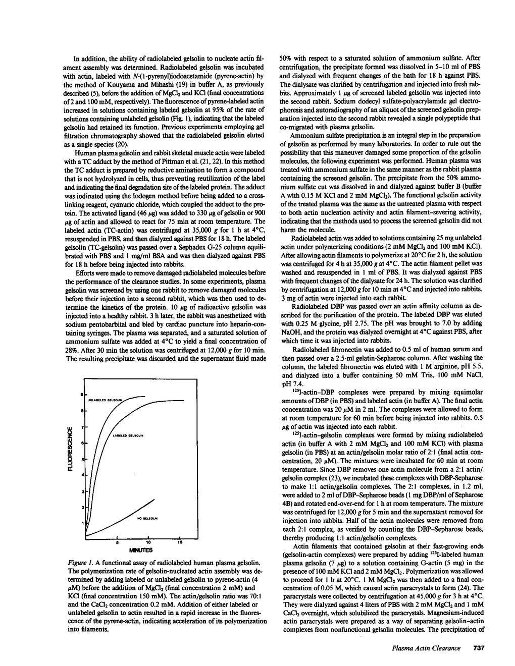 We determined the plasma kinetics of both actin and complexes of actin with the two high affinity actin-binding proteins of plasma, gelsolin, and vitamin D-binding protein (DBP). Actin is cleared rapidly from the plasma by the liver (half-disappearance time, 0.5 h). Using radiolabeled actin-binding proteins, we found that actin accelerated the clearance of both plasma gelsolin and the vitamin D-binding protein. In separate experiments we found that DBP-actin complexes were cleared more quickly than gelsolin-actin complexes, at a rate comparable to the clearance of actin from the blood. A low affinity interaction (dissociation constant, 2.9 X 10(-4) M) between actin and fibronectin was found, suggesting that little actin will bind to fibronectin in plasma. We conclude that while plasma gelsolin and DBP may both clear actin from the circulation, DBP appears to play a more important role. By so doing, DBP may conserve the filament-severing activity of plasma gelsolin.