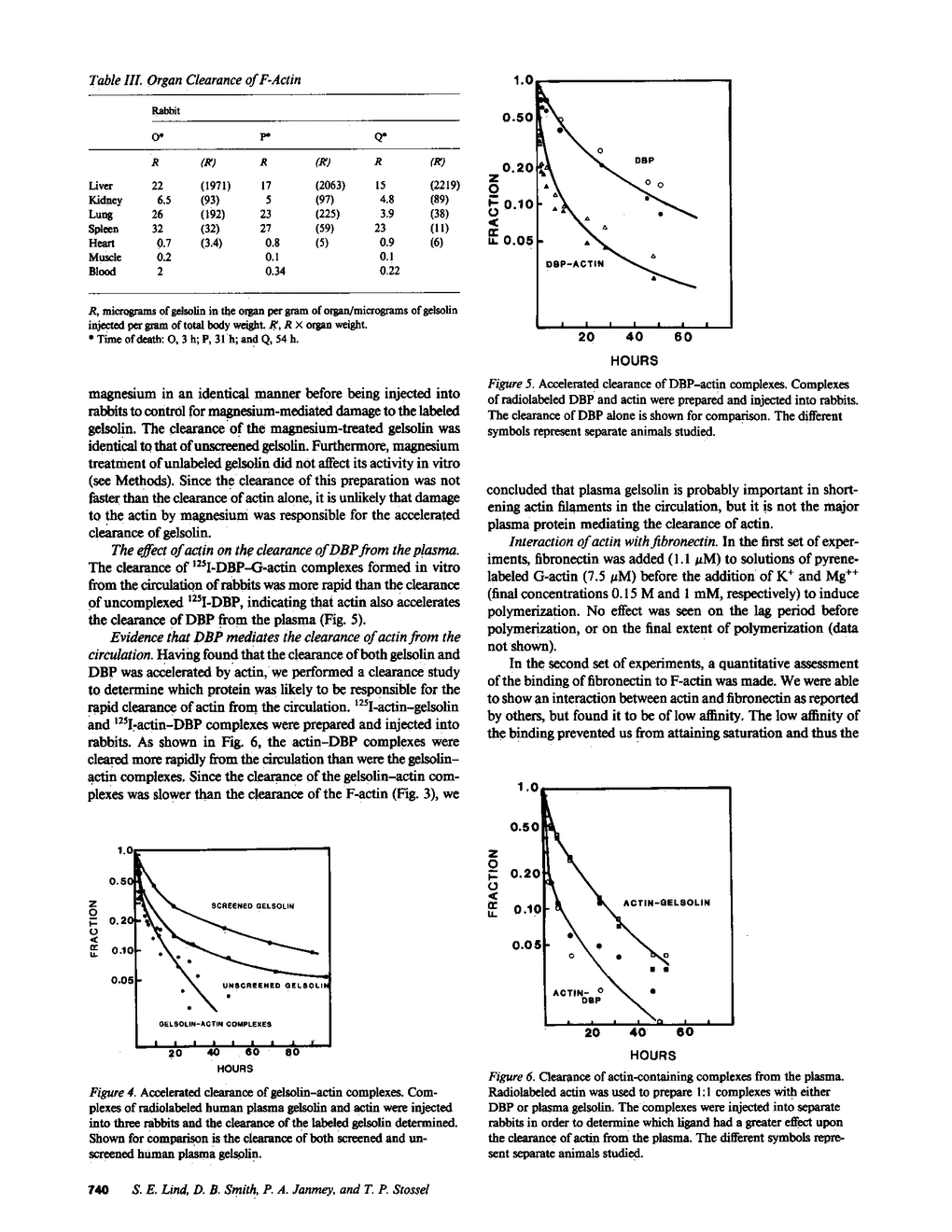 We determined the plasma kinetics of both actin and complexes of actin with the two high affinity actin-binding proteins of plasma, gelsolin, and vitamin D-binding protein (DBP). Actin is cleared rapidly from the plasma by the liver (half-disappearance time, 0.5 h). Using radiolabeled actin-binding proteins, we found that actin accelerated the clearance of both plasma gelsolin and the vitamin D-binding protein. In separate experiments we found that DBP-actin complexes were cleared more quickly than gelsolin-actin complexes, at a rate comparable to the clearance of actin from the blood. A low affinity interaction (dissociation constant, 2.9 X 10(-4) M) between actin and fibronectin was found, suggesting that little actin will bind to fibronectin in plasma. We conclude that while plasma gelsolin and DBP may both clear actin from the circulation, DBP appears to play a more important role. By so doing, DBP may conserve the filament-severing activity of plasma gelsolin.