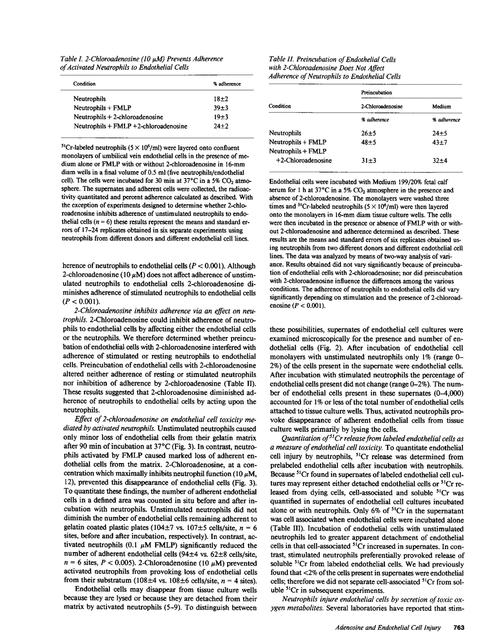 Since adenosine and its analogue 2-chloroadenosine prevent neutrophils from generating superoxide anion in response to chemoattractants, we sought to determine whether these agents could inhibit neutrophil-mediated injury of endothelial cells. The chemoattractant N-formyl-methionyl-leucyl-phenylalanine (FMLP, 0.1 microM) enhanced the adherence of neutrophils to endothelial cells twofold (18 +/- 2% vs. 39 +/- 3% adherence, P less than 0.001) and caused substantial neutrophil-mediated injury to endothelial cells (2 +/- 2% vs. 39 +/- 4% cytotoxicity, P less than 0.001). 2-Chloroadenosine (10 microM) not only inhibited the adherence of stimulated neutrophils by 60% (24 +/- 2% adherence, P less than 0.001) but also diminished the cytotoxicity by 51% (20 +/- 4% cytotoxicity, P less than 0.002). Furthermore, depletion of endogenously released adenosine from the medium by adenosine deaminase-enhanced injury to endothelial cells by stimulated neutrophils (from 39 +/- 4% to 69 +/- 3% cytotoxicity, P less than 0.001). Indeed, in the presence of adenosine deaminase, even unstimulated neutrophils injured endothelial cells (19 +/- 4% vs. 2 +/- 2% cytotoxicity, P less than 0.001). These data indicate that engagement of adenosine receptors prevents both the adhesion of neutrophils and the injury they cause to endothelial cells. Adenosine inhibits injury provoked not only by cells that have been stimulated by chemoattractants but also by unstimulated cells. Based on this model of acute vascular damage we suggest that adenosine is not only a potent vasodilator, but plays the additional role of protecting vascular endothelium from damage by neutrophils.