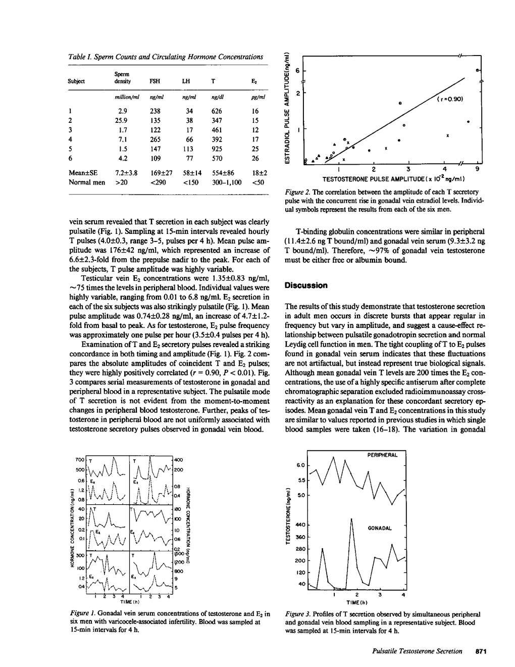 In spite of a striking pulsatile pattern of luteinizing hormone (LH) secretion, testosterone (T) fluctuations in peripheral blood in normal adult men are irregular and of low amplitude. To determine whether T secretion by the human testis is episodic, T was measured in blood samples drawn at 15-min intervals for 4 h through a catheter placed in the testicular vein of six men with varicocele-associated infertility. Estradiol (E2) concentrations were also determined in each sample. Each subject released testosterone in well-defined pulses. Gonadal vein T levels ranged from 1 to 1,540 ng/ml. Mean (+/- SE) pulse amplitude was 176 +/- 42 ng/ml, with a frequency of 4.0 +/- 0.3 pulses per 4 h. Testicular vein E2 levels ranged from 0.01 to 6.8 ng/ml. E2 secretory episodes were generally coincident with T pulses, and their amplitudes were highly positively correlated (r = 0.90, P less than 0.01). These results indicate that T secretion by the adult human testis is pulsatile, and suggest a functional relationship between intermittent LH secretion and normal testicular steroidogenesis in men. The failure to appreciate these fluctuations as hormone pulses in peripheral blood may relate to their absolute amplitude and frequency. The concordance between E2 and T pulses suggests that the Leydig cell, under LH control, is the source of most of the E2 secreted by the adult human testis.