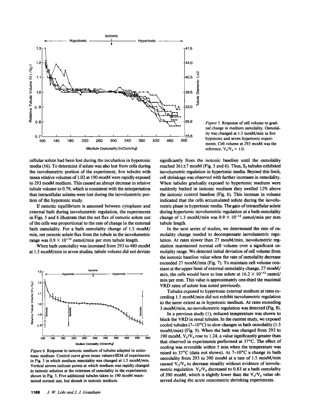 Sudden alteration in medium osmolality causes an osmometric change in proximal tubule cell size followed by restoration of cell volume toward normal in hypotonic but not in hypertonic medium. We determined the capability of isolated nonperfused proximal tubules to prevent a change in cell volume in anisotonic media. The external osmolality was gradually changed over a range from 110 to 480 mosM. At 1.5 mosM/min, cell volume remained constant between 167 +/- 9 and 361 +/- 7 mosM, a phenomenon termed isovolumetric regulation (IVR). Cells lost intracellular solutes in hypotonic and gained intracellular solutes in hypertonic media. Raffinose or choline chloride substitution showed that osmolality, rather than NaCl, signalled cell volume maintenance in hyperosmotic media. Cooling (7-10 degrees C) blocked IVR. IVR was maintained when osmolality was lowered at a rate of 27, but not at 42 mosM/min. IVR was not observed when the rate of osmolality increase exceeded 3 mosM/min. We conclude that proximal tubule cells sensitively regulate intracellular volume in an osmolality range of pathophysiologic interest by mechanisms dependent on the rate of net water movement across basolateral membranes and the absolute intracellular content of critical solutes.