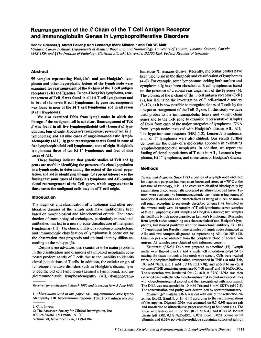 55 samples representing Hodgkin's and non-Hodgkin's lymphoma and other hyperplastic lesions of the lymph node were examined for rearrangement of the beta chain of the T cell antigen receptor (TcR) and Ig genes. In non-Hodgkin's lymphoma, rearrangement of TcR beta was found in all 14 T cell lymphomas and in two of the seven B cell lymphomas. Ig gene rearrangement was found in none of the 14 T cell lymphomas and in all seven B cell lymphomas. We also examined DNA from lymph nodes in which the lineage of the malignant cell is not clear. Rearrangement of TcR beta was found in all five lymphoepitheloid cell (Lennert's) lymphomas; four of eight Hodgkin's lymphomas; seven of ten Ki 1+ lymphomas; and all nine cases of angioimmunoblastic lymphoadenopathy (AIL). Ig gene rearrangement was found in none of five lymphoepitheloid cell lymphomas; none of eight Hodgkin's lymphomas; three of ten Ki 1+ lymphomas; and four of nine cases of AIL. These findings indicate that genetic studies of TcR and Ig genes are useful in identifying the presence of a clonal population in a lymph node, in determining the extent of the clonal population, and aid in identifying lineage. Of special interest was the finding that some cases of Hodgkin's lymphoma and AIL contain clonal rearrangement of the TcR genes, which suggests that in those cases the malignant cells may be of T cell origin.