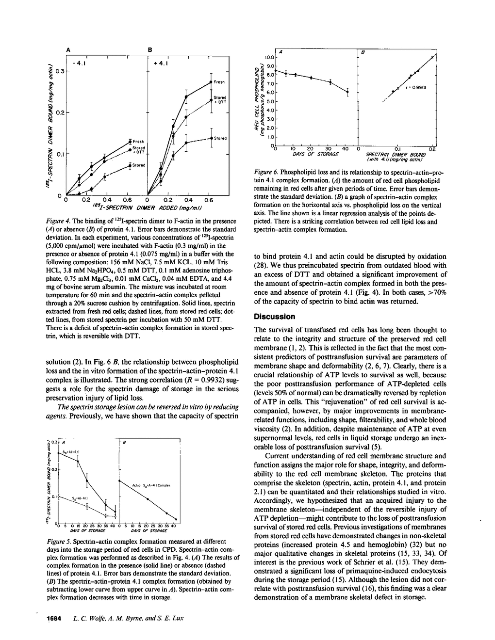 During liquid preservation under blood bank conditions, red cell membranes inexorably undergo damage that decreases erythrocyte survival after transfusion. Accordingly, we have surveyed membrane skeletal protein interactions during storage. We uncovered a decrease in the in vitro formation of spectrin-actin complex in the absence (50%) or presence (60%) of protein 4.1. Actual formation of the spectrin-actin-protein 4.1 complex fell in a linear fashion during the storage period. This fall in spectrin-actin interaction tightly correlated with the decline in total red cell phospholipid (R = 0.9932) measured simultaneously. This decrement of spectrin-actin association could be restored to greater than 70% of normal values by preincubation of stored spectrin with 50 mM dithiothreitol. This storage injury to spectrin-actin interaction might weaken the membrane skeleton and lead to decreased red cell survival. In vitro reversibility of the damage by reducing agents suggests a possible new direction for prolonging the shelf life of stored blood.
