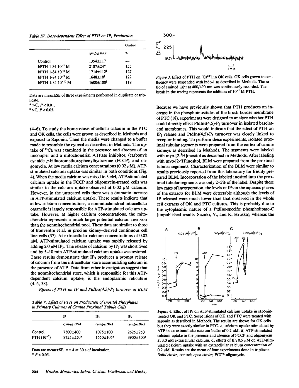 Parathyroid hormone (PTH) produced a dose-dependent immediate stimulation of inositol triphosphate and diacylglycerol production in the opossum kidney cell line, primary culture proximal tubular cells, and basolateral membranes from canine proximal tubular segments. The increase in inositol triphosphate production was accompanied by a minor increase in inositol phosphate and no significant increase in inositol bisphosphate production. Associated with the changes in inositol triphosphate and diacylglycerol, there was an immediate hydrolysis of phosphatidylinositol 4'5-bisphosphate. The effect on phospholipid hydrolysis was followed by stimulation of phosphorylation of phosphatidylinositol 4' monophosphate and phosphatidylinositol. PTH produced a sudden increase in cytoplasmic Ca2+ in opossum kidney cells that persisted for approximately 1 min. Inositol triphosphate transiently increased cytoplasmic Ca2+ in saponin-treated opossum kidney and primary culture proximal tubule cells. The effects of PTH were not mimicked by cyclic nucleotides. In fact, cyclic AMP appeared to diminish inositol triphosphate production. These results demonstrate that PTH may activate renal tubular epithelial cells by the production of inositol triphosphate and diacylglycerol.