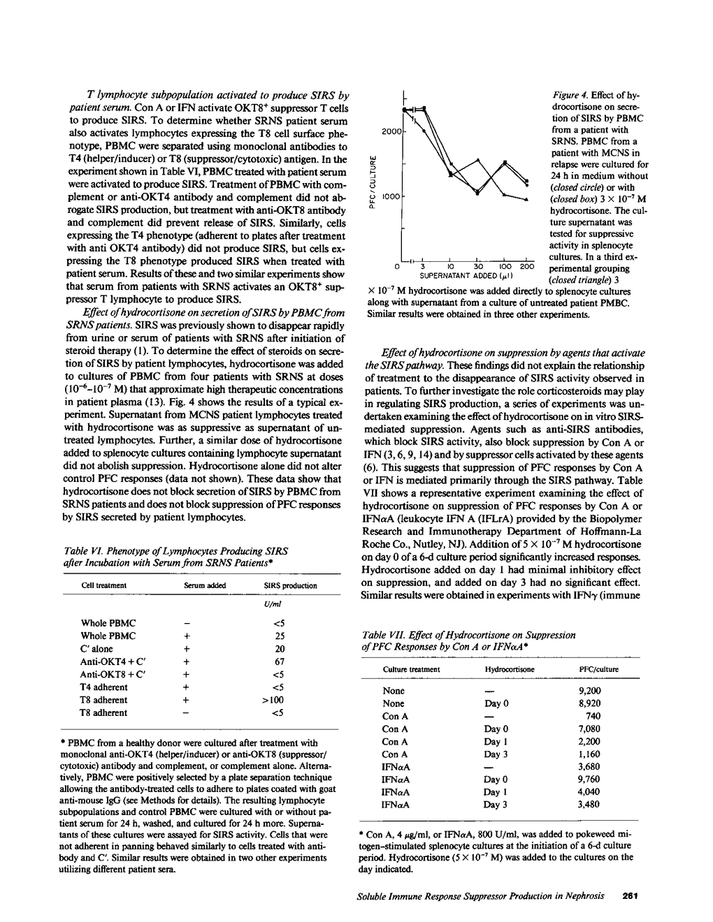 Soluble immune response suppressor (SIRS), a lymphokine that suppresses antibody production and delayed type hypersensitivity in vivo, has been detected in urine and serum from certain patients with nephrotic syndrome. In the present paper, the relationship between SIRS production and nephrotic syndrome is further characterized. A striking correlation was found between detection of SIRS and the presence of steroid-responsive nephrotic syndrome (SRNS). A potential mechanism of SIRS production in SRNS patients was identified, in that lymphocytes from patients produced SIRS without requiring activation by exogenous agents, and incubation of normal lymphocytes with serum from patients activated the cells to secrete SIRS in culture. Although SIRS disappears rapidly from urine or serum after initiation of corticosteroid therapy, hydrocortisone (10(-6)-10(-7) M) did not block secretion of SIRS by activated suppressor cells. It did, however, inhibit in vitro activation of lymphocytes to produce SIRS by concanavalin A, interferon, or SRNS patient serum. The association of suppressor cell activation with SRNS and the sensitivity of both to steroids suggest that the pathogeneses of albuminuria and SIRS production are related.