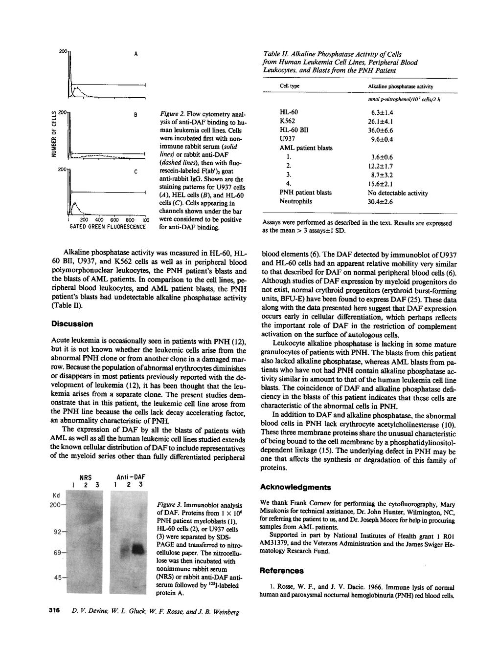 Paroxysmal nocturnal hemoglobinuria (PNH) is an acquired hematopoietic stem cell disorder in which the blood cells demonstrate aberrant interactions with serum complement. In part, this is due to the absence of the complement regulatory protein, decay accelerating factor (DAF). A small number of patients with PNH have gone on to develop acute nonlymphocytic leukemia, which is thought to arise from the injured marrow as a second hematopoietic disorder. We have studied a patient with PNH who developed acute myeloblastic leukemia (AML); the blasts from this patient were found to lack DAF as measured by polyclonal antibody binding and fluorescence flow cytometry as well as by immunoblotting. The blasts from 11 other patients with AML bound anti-DAF antibody in amounts similar to normal mononuclear cells from healthy donors. Cells of the human leukemia cell lines HL-60, K562, U937, and HEL also bound anti-DAF antibody. In addition to DAF deficiency, blasts from the PNH patient had undetectable alkaline phosphatase activity, in contrast to human leukemia cell lines. These data suggest that the leukemic cells of the PNH patient arose out of the PNH clone and that AML in the setting of PNH is not a separate disorder.