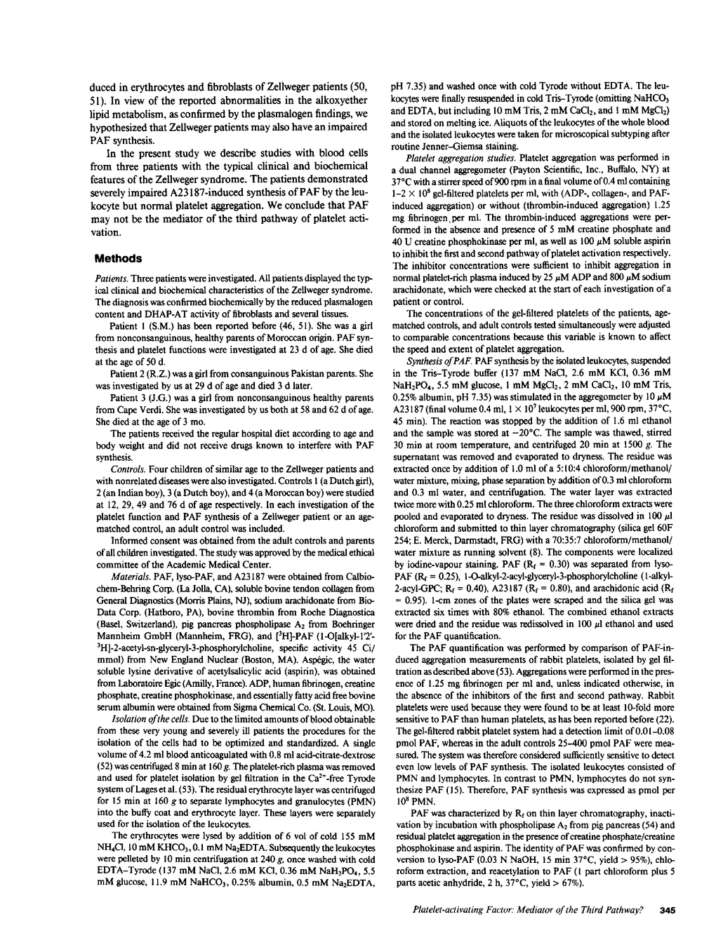 Thrombin, collagen, and Ca2+-ionophore A23187 aggregate platelets in the presence of inhibitors of the first (ADP-mediated) and second (cyclooxygenase-dependent) pathway of platelet activation. This aggregation, via a third pathway, was hypothesized to be mediated by the alkoxyether lipid platelet-activating factor (PAF). We recently demonstrated virtual absence of plasmalogen-type alkoxyether lipids and deficiency in key enzymes of their biosynthesis in Zellweger patients. We hypothesized that PAF synthesis might also be impaired. We report two Zellweger patients with an undetectable A23187-induced PAF synthesis of leukocytes (patients, less than 3 pmol PAF/10(8) granulocytes (PMN); four age-matched controls, 249-2,757 pmol PAF/10(8) PMN; five adult controls, 291-5,433 pmol PAF/10(8) PMN). In a third patient, residual PAF synthesis was detected. However in all patients the thrombin-induced third mechanism of platelet aggregation was present. We therefore conclude that PAF may not be the mediator of the third pathway.