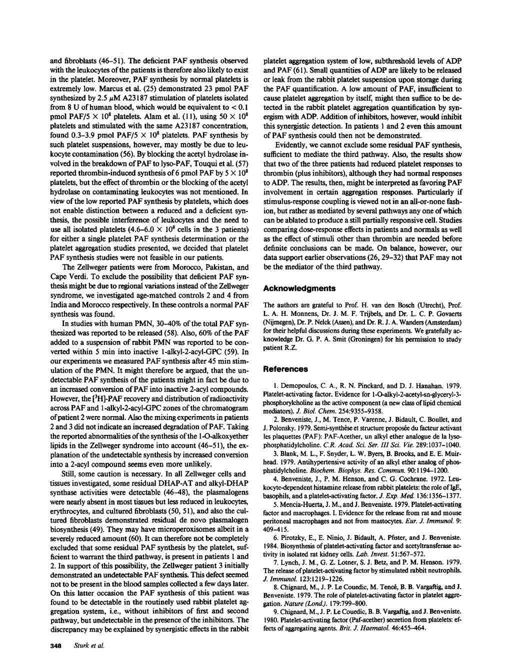 Thrombin, collagen, and Ca2+-ionophore A23187 aggregate platelets in the presence of inhibitors of the first (ADP-mediated) and second (cyclooxygenase-dependent) pathway of platelet activation. This aggregation, via a third pathway, was hypothesized to be mediated by the alkoxyether lipid platelet-activating factor (PAF). We recently demonstrated virtual absence of plasmalogen-type alkoxyether lipids and deficiency in key enzymes of their biosynthesis in Zellweger patients. We hypothesized that PAF synthesis might also be impaired. We report two Zellweger patients with an undetectable A23187-induced PAF synthesis of leukocytes (patients, less than 3 pmol PAF/10(8) granulocytes (PMN); four age-matched controls, 249-2,757 pmol PAF/10(8) PMN; five adult controls, 291-5,433 pmol PAF/10(8) PMN). In a third patient, residual PAF synthesis was detected. However in all patients the thrombin-induced third mechanism of platelet aggregation was present. We therefore conclude that PAF may not be the mediator of the third pathway.