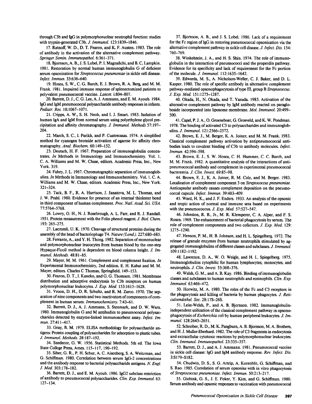 Two approaches were used to demonstrate that reduction in serum opsonization of Streptococcus pneumoniae via the alternative complement pathway in children with sickle cell disease is related to a deficiency of antibodies to pneumococcal capsular polysaccharide. First, opsonization of S. pneumoniae mediated by the alternative pathway in patients' sera was restored to normal by addition of the purified IgG or IgM fraction of goat antiserum to capsular polysaccharide of the homologous serotype. Secondly, IgG antibody titers to capsular polysaccharide in patients' sera correlated significantly with alternative pathway-mediated opsonization; the correlation between titers of IgM anticapsular antibodies and opsonization approached statistical significance. The sum of the IgG and IgM anticapsular antibody titers correlated most significantly with opsonization. Our results suggest that reduction in alternative pathway-mediated opsonization in sera from children with sickle cell disease is related to low levels of both IgG and IgM anticapsular antibodies.