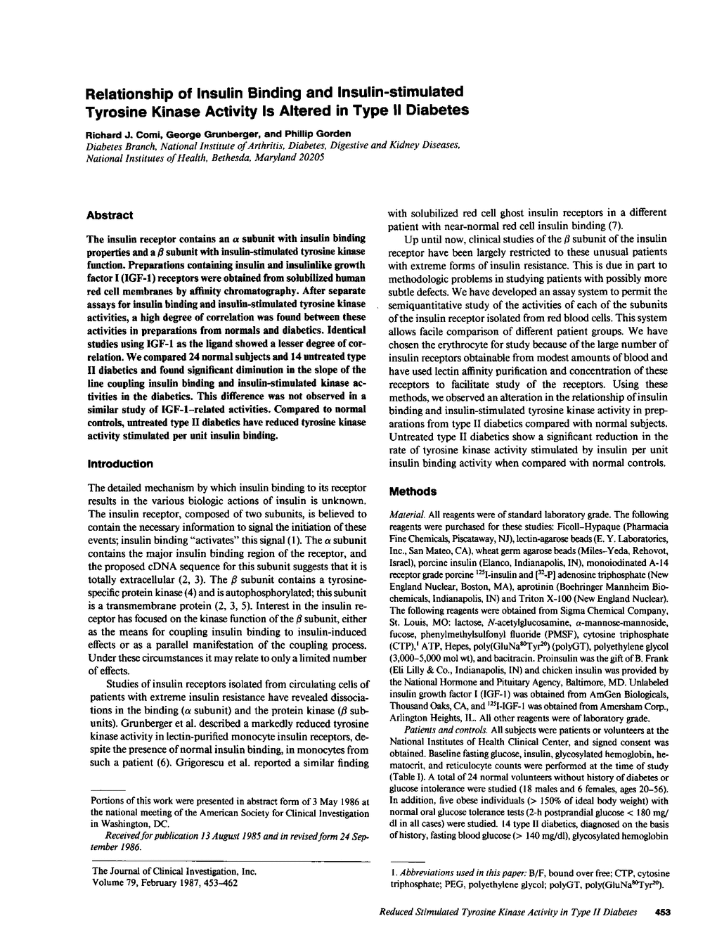 The insulin receptor contains an alpha subunit with insulin binding properties and a beta subunit with insulin-stimulated tyrosine kinase function. Preparations containing insulin and insulinlike growth factor I (IGF-I) receptors were obtained from solubilized human red cell membranes by affinity chromatography. After separate assays for insulin binding and insulin-stimulated tyrosine kinase activities, a high degree of correlation was found between these activities in preparations from normals and diabetics. Identical studies using IGF-I as the ligand showed a lesser degree of correlation. We compared 24 normal subjects and 14 untreated type II diabetics and found significant diminution in the slope of the line coupling insulin binding and insulin-stimulated kinase activities in the diabetics. This difference was not observed in a similar study of IGF-I-related activities. Compared to normal controls, untreated type II diabetics have reduced tyrosine kinase activity stimulated per unit insulin binding.