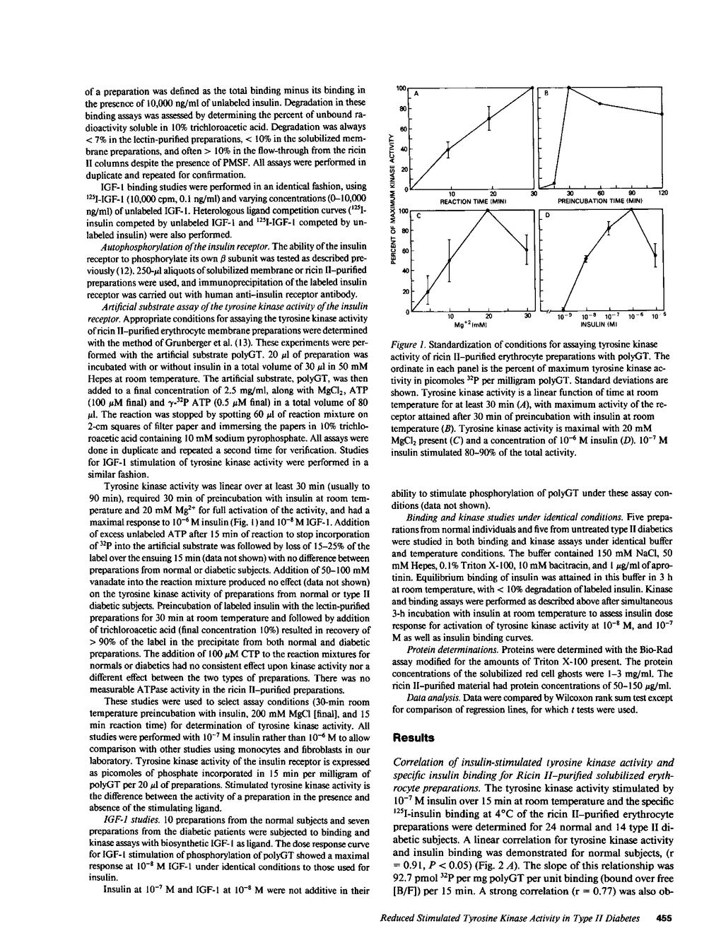 The insulin receptor contains an alpha subunit with insulin binding properties and a beta subunit with insulin-stimulated tyrosine kinase function. Preparations containing insulin and insulinlike growth factor I (IGF-I) receptors were obtained from solubilized human red cell membranes by affinity chromatography. After separate assays for insulin binding and insulin-stimulated tyrosine kinase activities, a high degree of correlation was found between these activities in preparations from normals and diabetics. Identical studies using IGF-I as the ligand showed a lesser degree of correlation. We compared 24 normal subjects and 14 untreated type II diabetics and found significant diminution in the slope of the line coupling insulin binding and insulin-stimulated kinase activities in the diabetics. This difference was not observed in a similar study of IGF-I-related activities. Compared to normal controls, untreated type II diabetics have reduced tyrosine kinase activity stimulated per unit insulin binding.