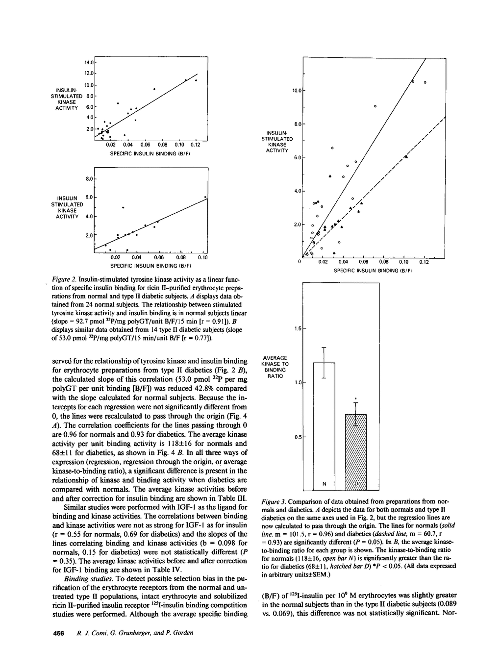 The insulin receptor contains an alpha subunit with insulin binding properties and a beta subunit with insulin-stimulated tyrosine kinase function. Preparations containing insulin and insulinlike growth factor I (IGF-I) receptors were obtained from solubilized human red cell membranes by affinity chromatography. After separate assays for insulin binding and insulin-stimulated tyrosine kinase activities, a high degree of correlation was found between these activities in preparations from normals and diabetics. Identical studies using IGF-I as the ligand showed a lesser degree of correlation. We compared 24 normal subjects and 14 untreated type II diabetics and found significant diminution in the slope of the line coupling insulin binding and insulin-stimulated kinase activities in the diabetics. This difference was not observed in a similar study of IGF-I-related activities. Compared to normal controls, untreated type II diabetics have reduced tyrosine kinase activity stimulated per unit insulin binding.