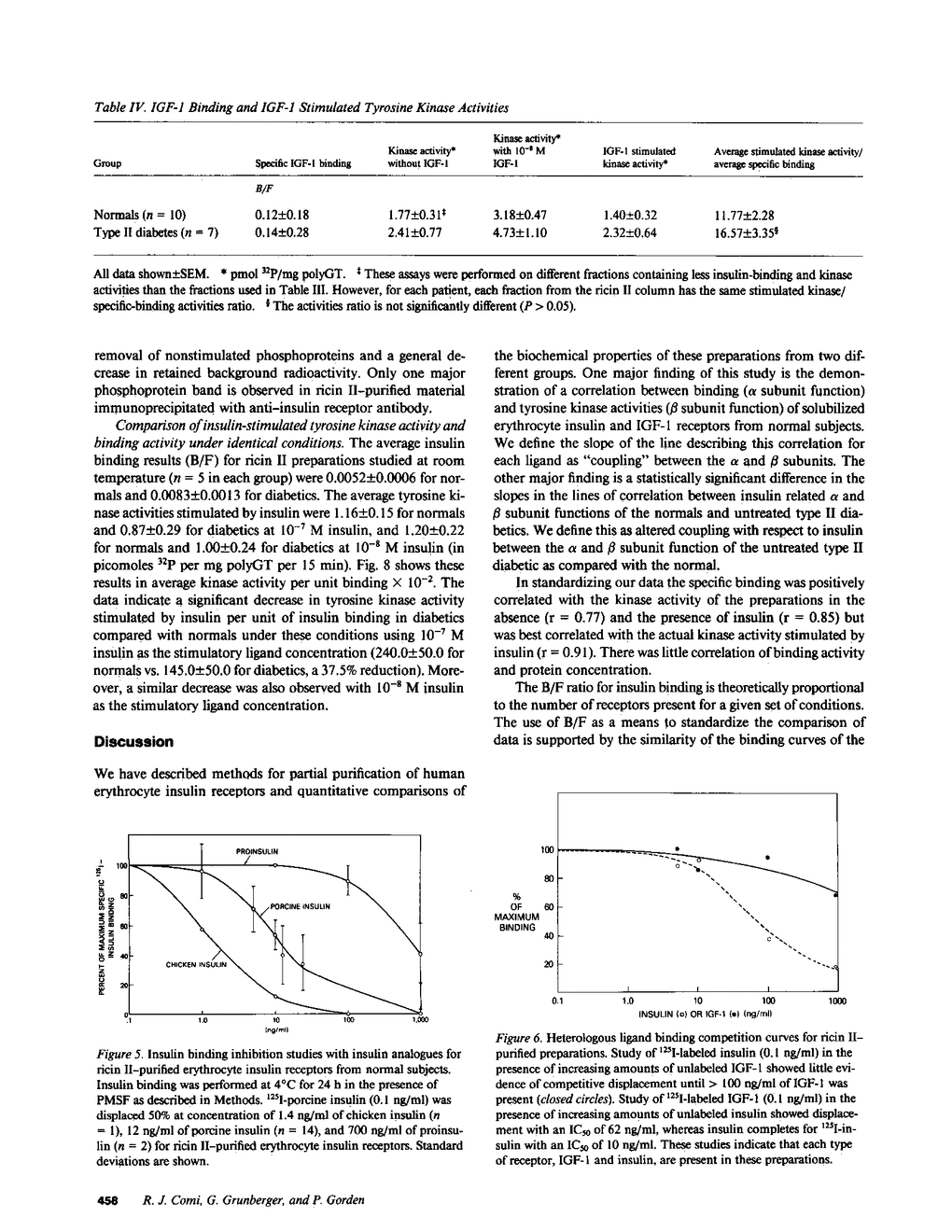 The insulin receptor contains an alpha subunit with insulin binding properties and a beta subunit with insulin-stimulated tyrosine kinase function. Preparations containing insulin and insulinlike growth factor I (IGF-I) receptors were obtained from solubilized human red cell membranes by affinity chromatography. After separate assays for insulin binding and insulin-stimulated tyrosine kinase activities, a high degree of correlation was found between these activities in preparations from normals and diabetics. Identical studies using IGF-I as the ligand showed a lesser degree of correlation. We compared 24 normal subjects and 14 untreated type II diabetics and found significant diminution in the slope of the line coupling insulin binding and insulin-stimulated kinase activities in the diabetics. This difference was not observed in a similar study of IGF-I-related activities. Compared to normal controls, untreated type II diabetics have reduced tyrosine kinase activity stimulated per unit insulin binding.